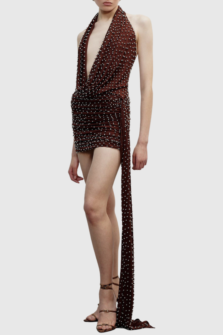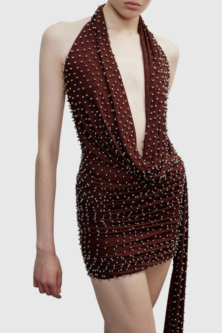 Elevate your evening with the Adlai Stud Embellished Halter Mini Dress, a striking piece that commands attention. This sophisticated design features carefully placed stud embellishments that catch the light with every movement, while the classic halter neckline offers timeless elegance. The mini silhouette creates a flattering, modern profile perfect for cocktail events, nights out, or special occasions. Crafted for those who appreciate refined details and bold style, this dress seamlessly transitions from dinner to dancing with understated glamour.