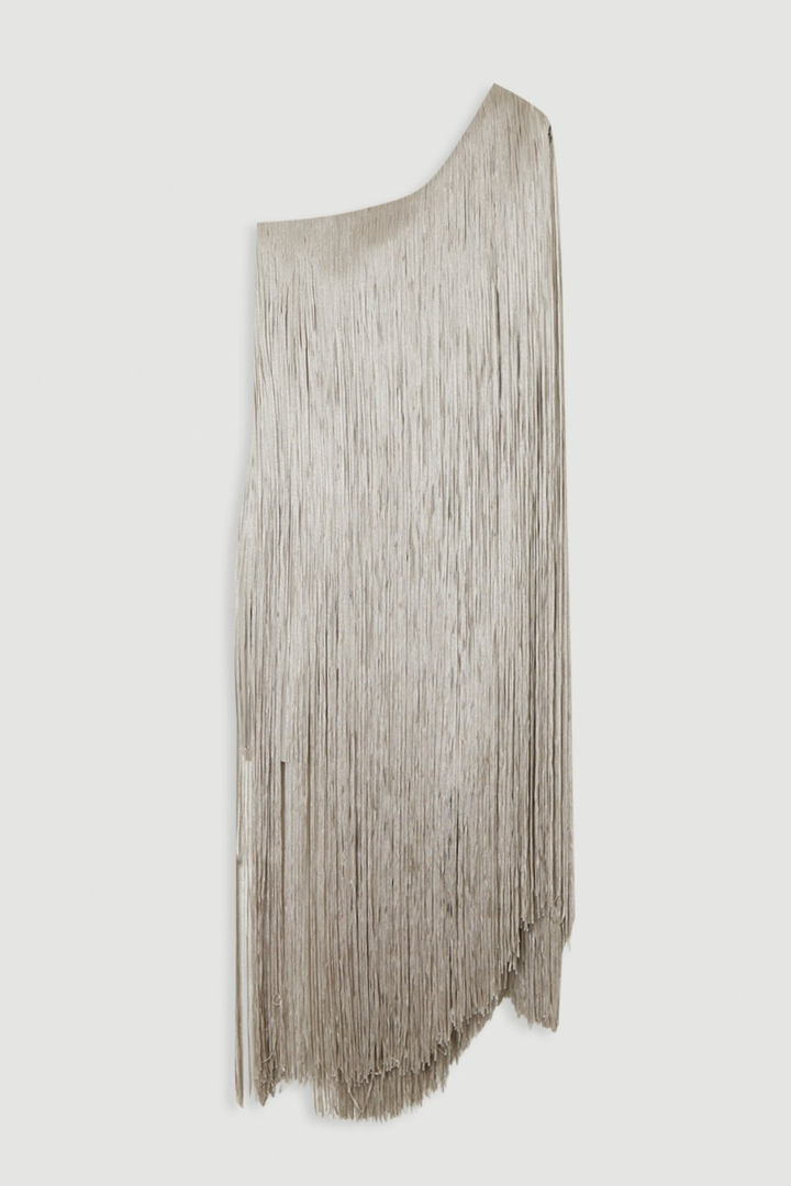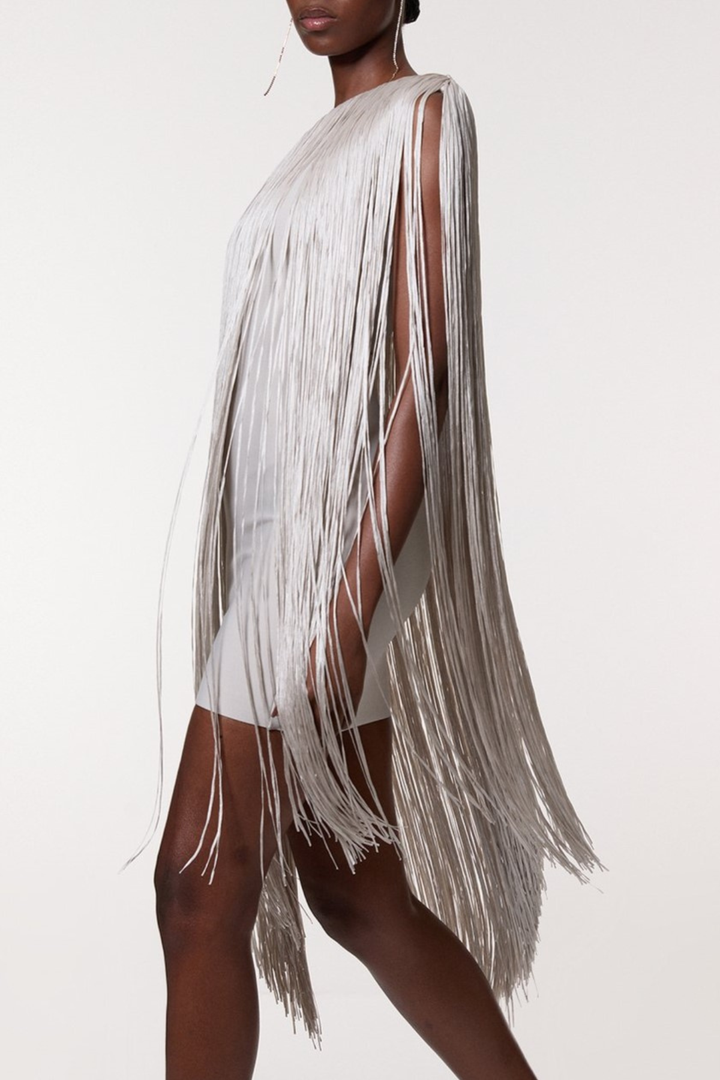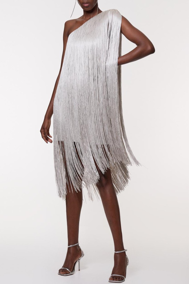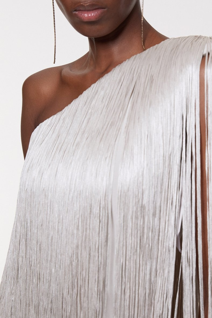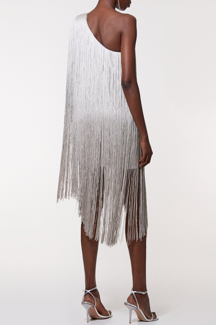 Aimee Bandage One Shoulder Fringe Mini Knit Dress - Silver