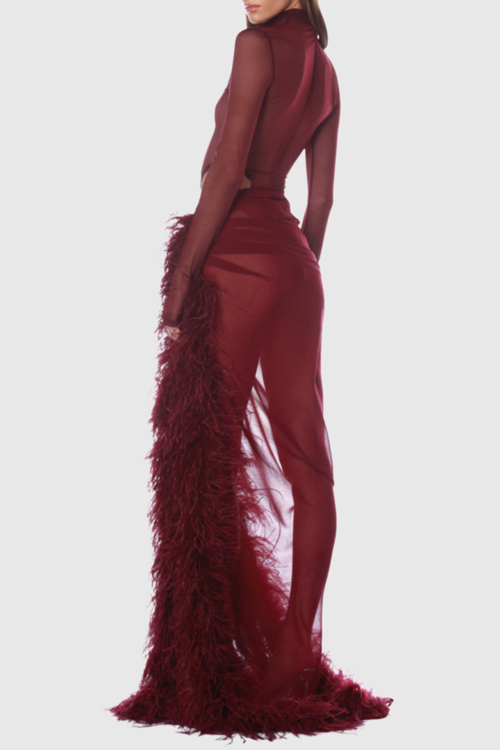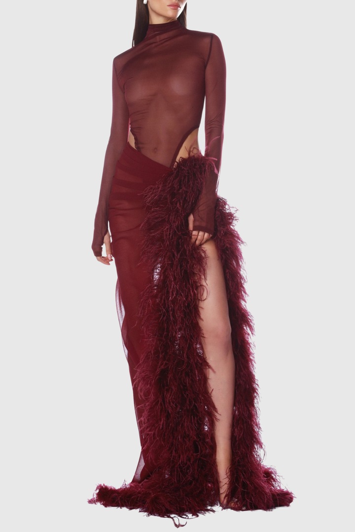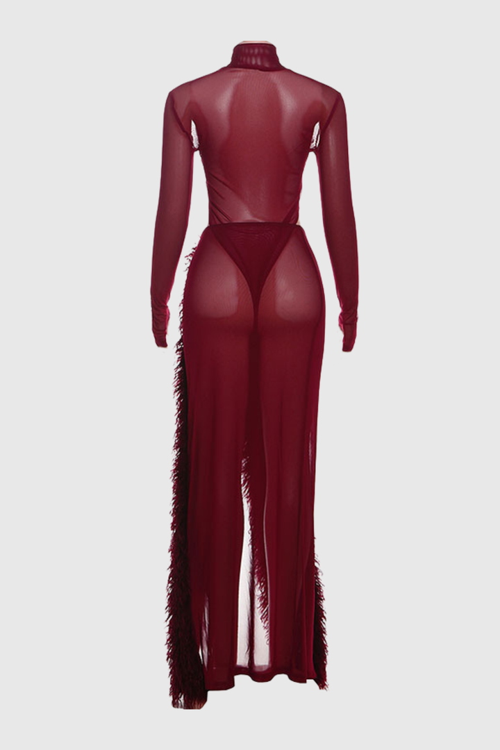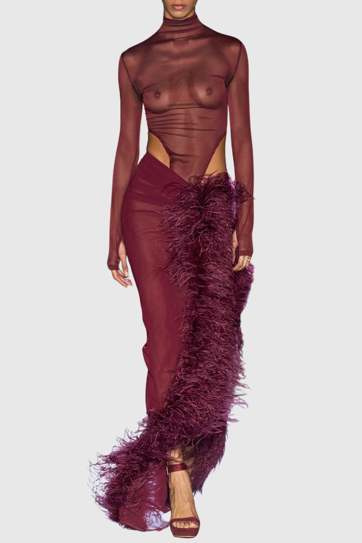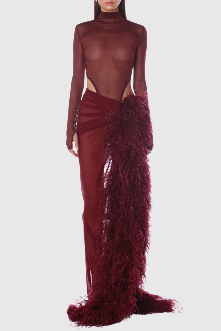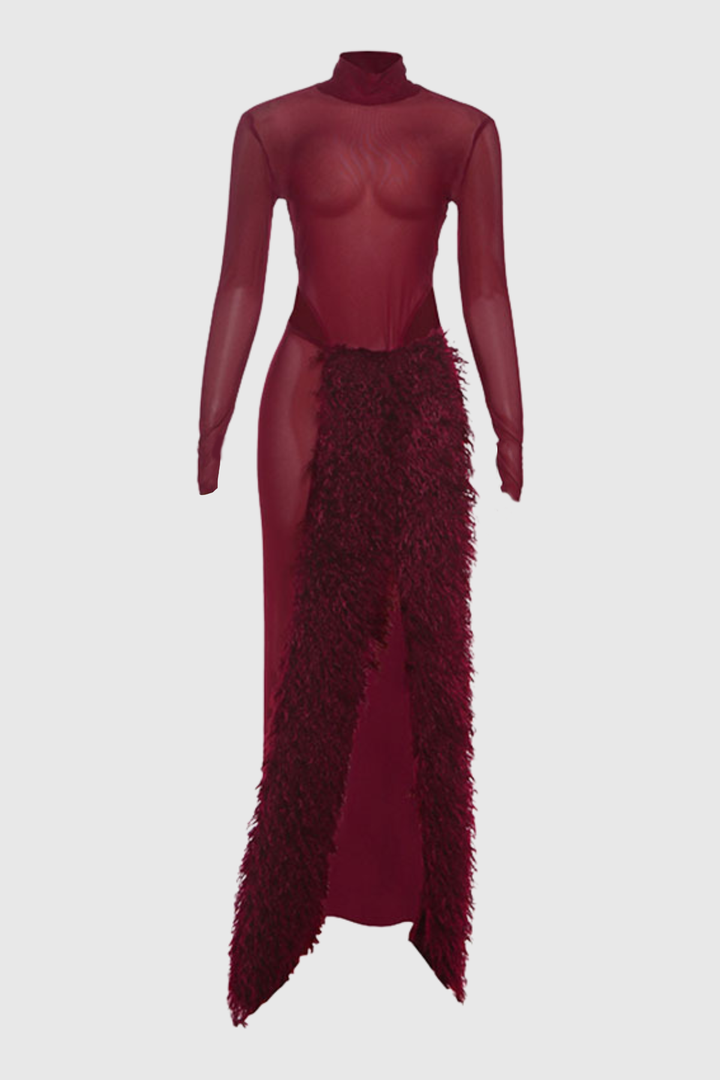 Akilah Mesh Bodysuit & Faux Fur Skirt Set - Wine
