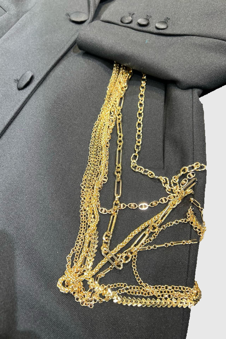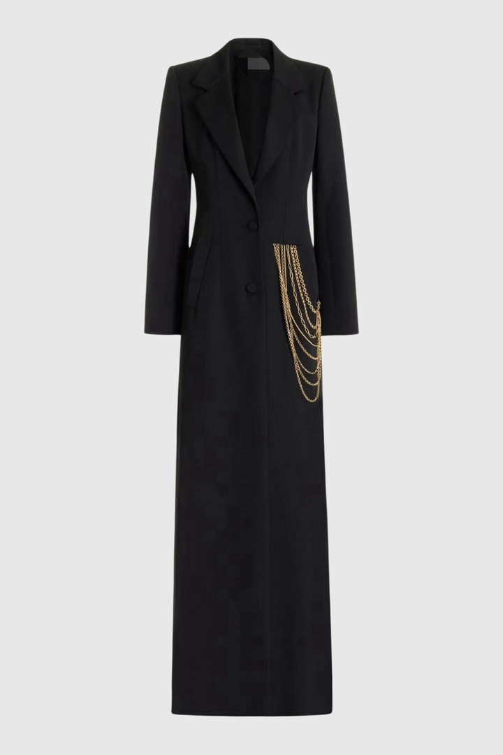 Elevate your wardrobe with the Aleca Gold Chain Embellished Coat, a refined piece that seamlessly blends timeless elegance with contemporary style. Featuring luxurious gold chain detailing that catches the light with every movement, this coat transforms an everyday essential into a statement garment. The sophisticated embellishment adds dimension and visual interest while maintaining a polished aesthetic perfect for both professional settings and upscale occasions. Crafted for those who appreciate understated luxury, this coat pairs effortlessly with tailored pieces or casual basics, making it a versatile investment for the discerning wardrobe.