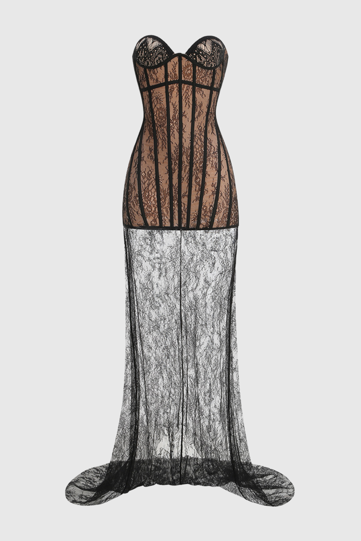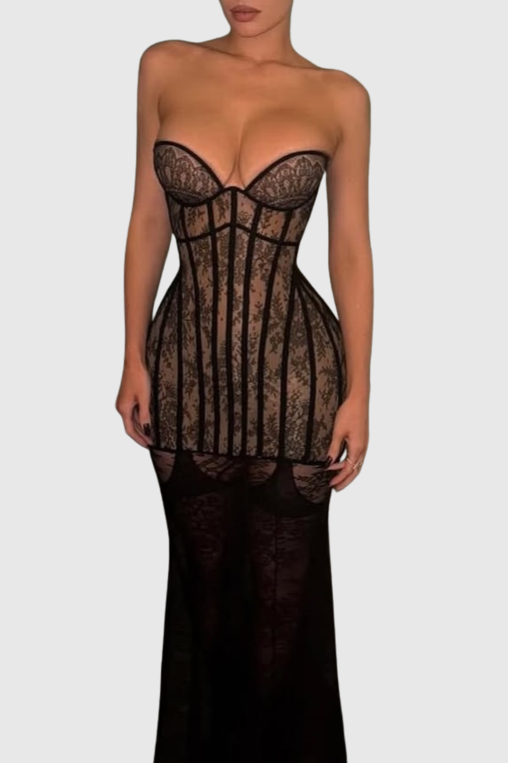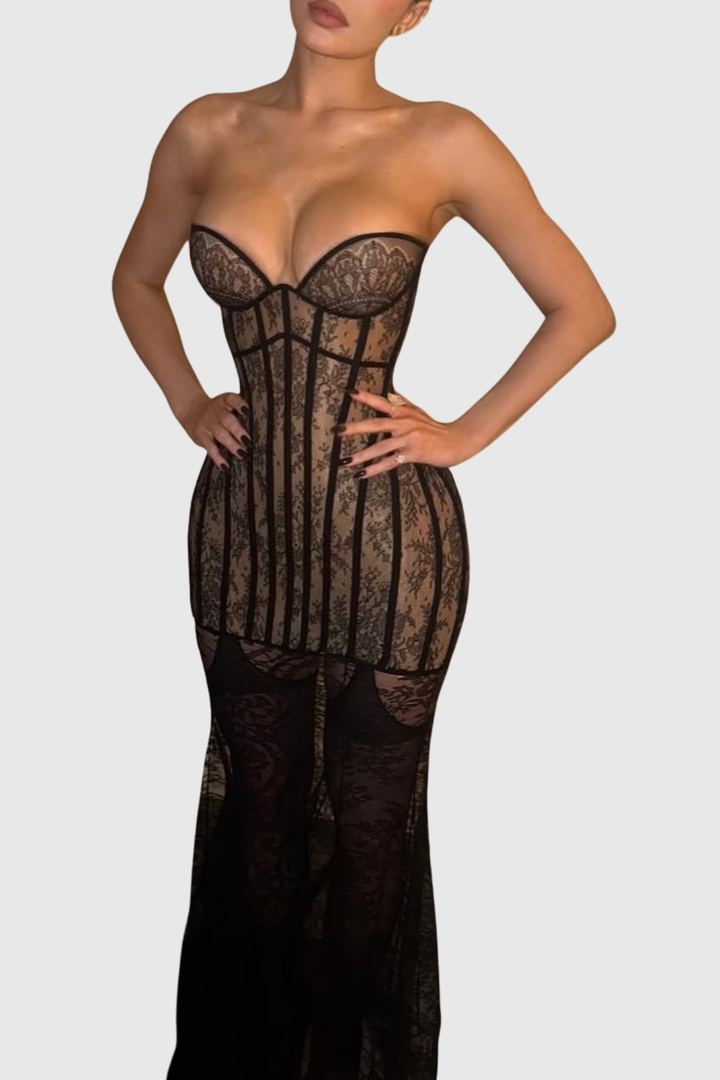 Elevate your evening wardrobe with the Alisha Strapless Lace Corset Maxi Dress, a timeless piece that seamlessly blends elegance with contemporary allure. Featuring delicate lace detailing and a structured corset bodice, this floor-length gown offers a flattering silhouette that commands attention. The strapless neckline creates a refined, graceful look perfect for formal occasions, galas, or upscale events. Crafted with meticulous attention to detail, this dress embodies sophisticated style and understated luxury for the discerning woman.