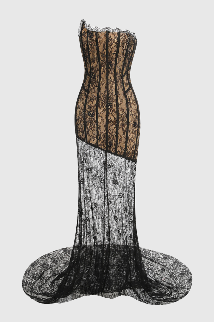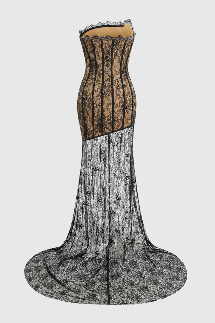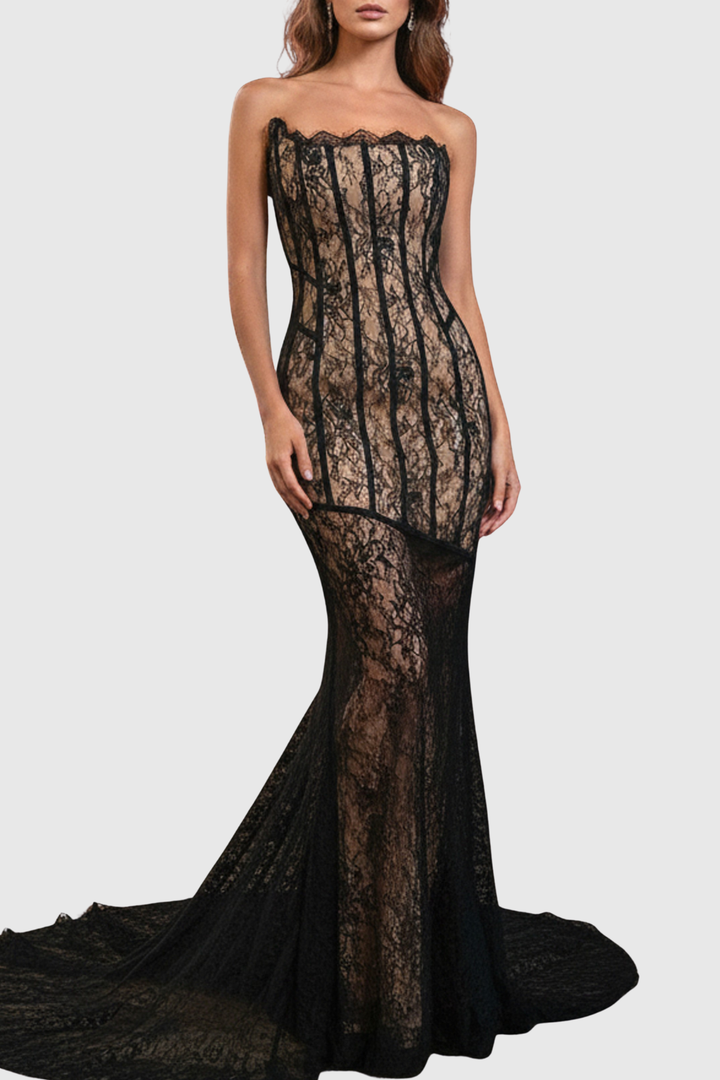 Alisha Strapless Lace Mermaid Maxi Dress Embrace timeless elegance with the Alisha, a strapless mermaid gown that commands attention. Delicate lace detailing adorns the bodice and cascades gracefully down the silhouette, creating an enchanting interplay of texture and refinement. The sweetheart neckline offers a flattering, romantic frame, while the fitted mermaid cut accentuates your curves before flowing into a dramatic maxi hem. Perfect for formal galas, weddings, or black-tie events, this dress exudes understated luxury and sophisticated allure.