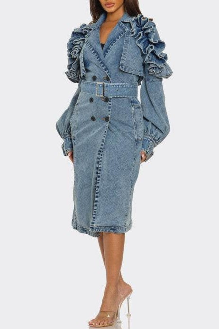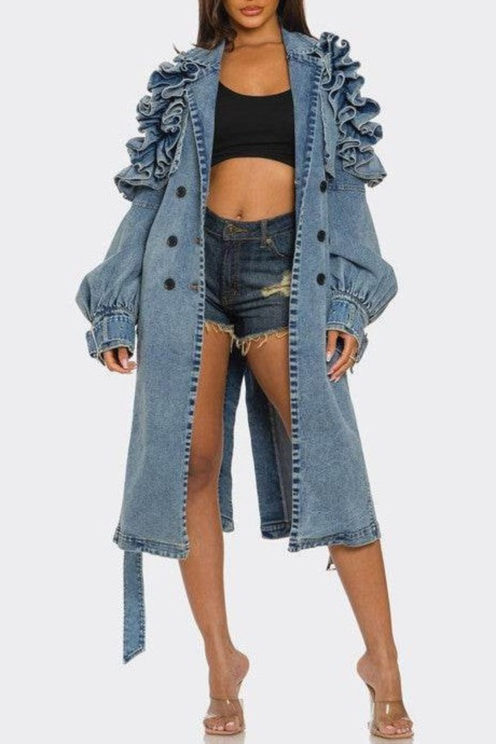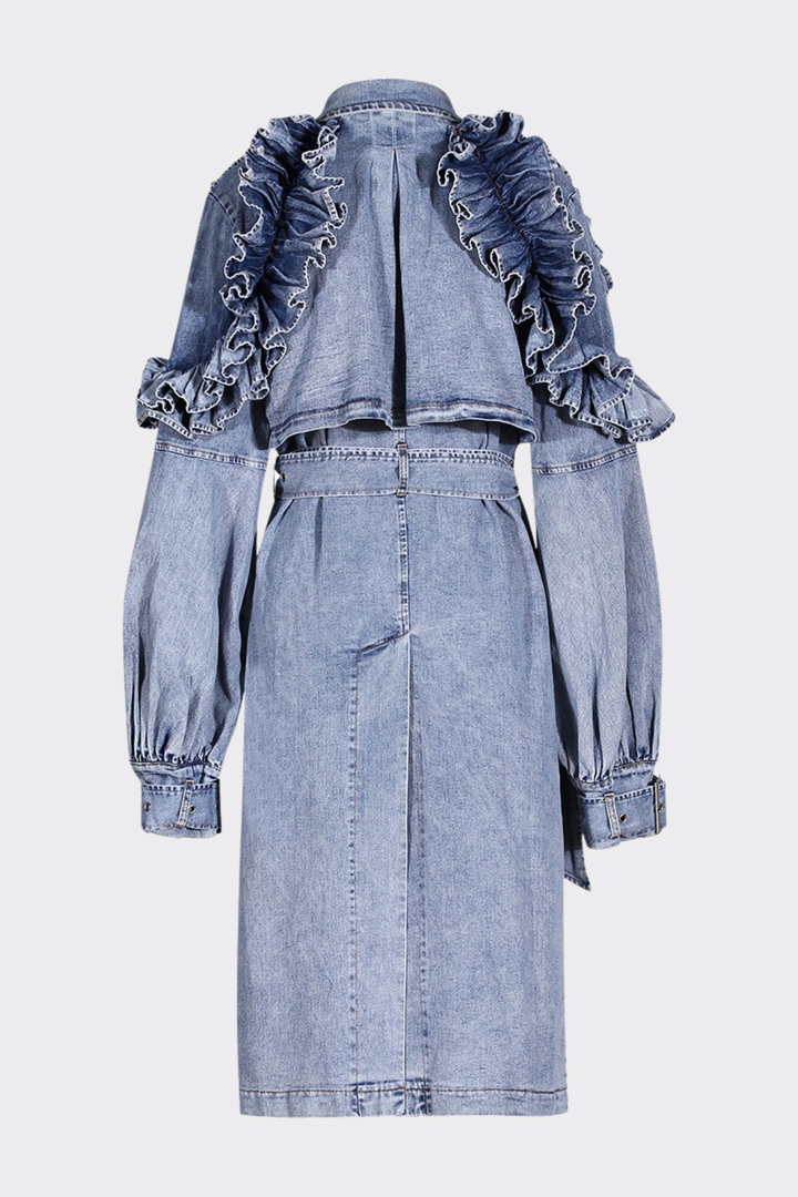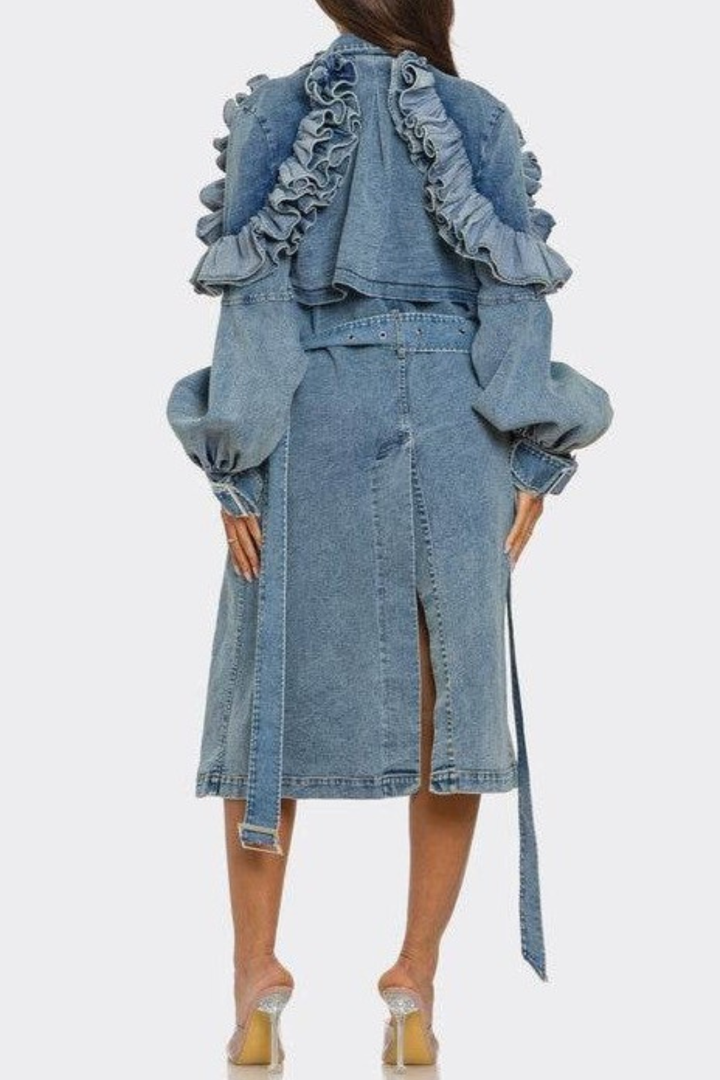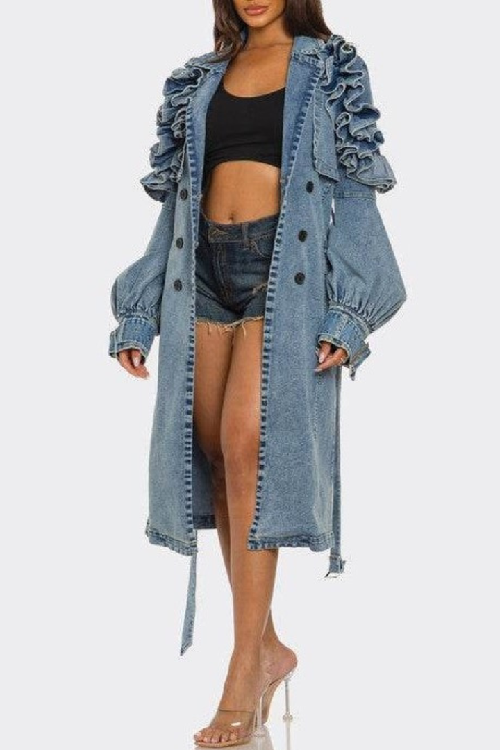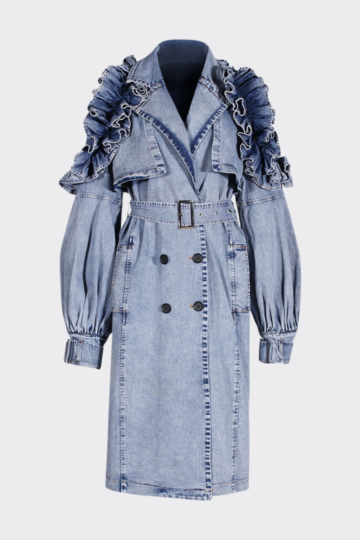 Elevate your denim collection with the Amaha Ruffle Denim Trench Coat, where classic tailoring meets contemporary flair. This statement piece features delicate ruffled detailing that adds movement and dimension to a timeless trench silhouette. Crafted from quality denim, it transitions seamlessly from casual to refined occasions. The structured fit and thoughtful construction ensure a polished appearance, while the ruffle accents provide an unexpected touch of elegance. Perfect for layering over dresses or pairing with tailored separates, this coat embodies understated sophistication with a modern edge.