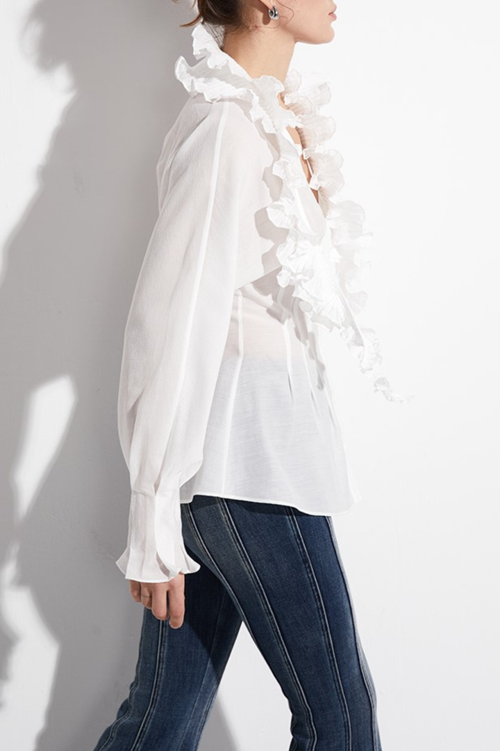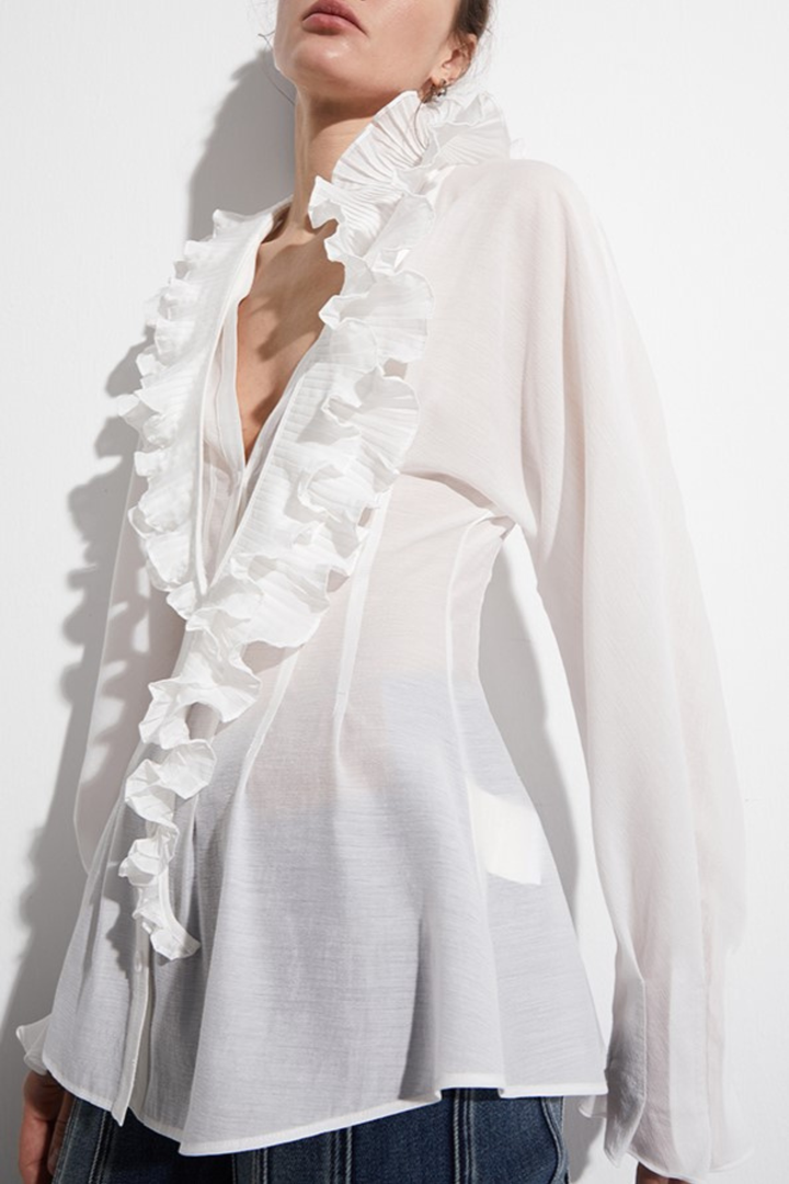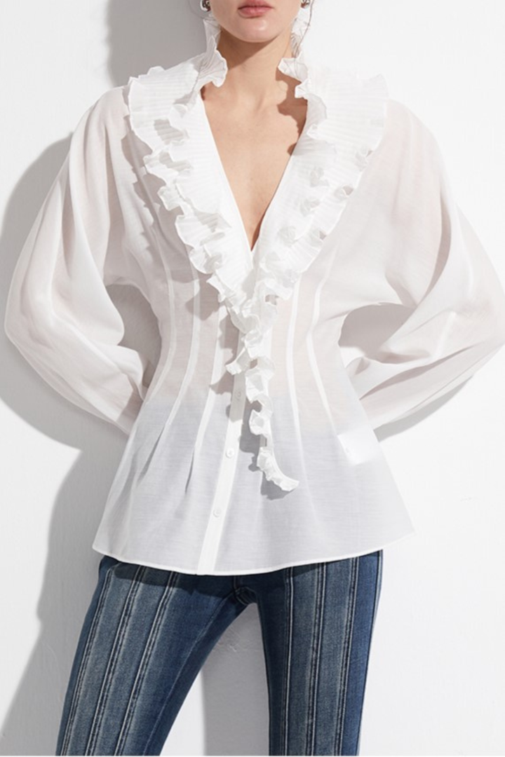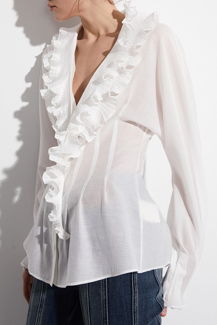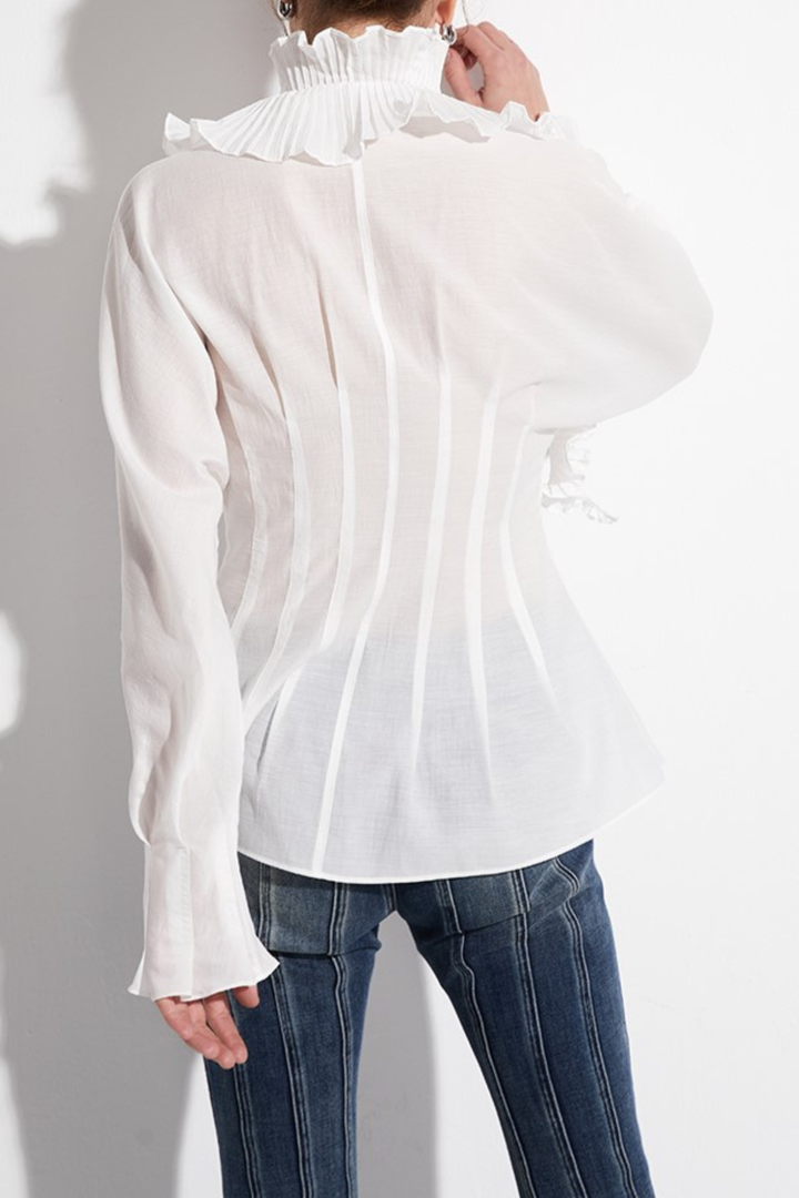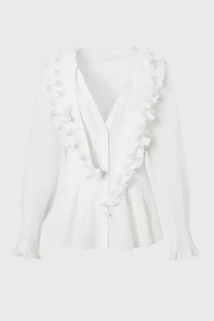 The Aminata Ruffle Corset Shirt combines structured elegance with romantic detailing. This sophisticated piece features a fitted corset-style bodice that flatters the silhouette, paired with delicate ruffled accents that add movement and visual interest. Perfect for elevated occasions or refined everyday styling, the shirt transitions seamlessly from professional settings to evening wear. The thoughtful construction ensures both comfort and confidence, making it an essential addition to any discerning wardrobe.