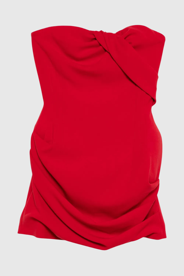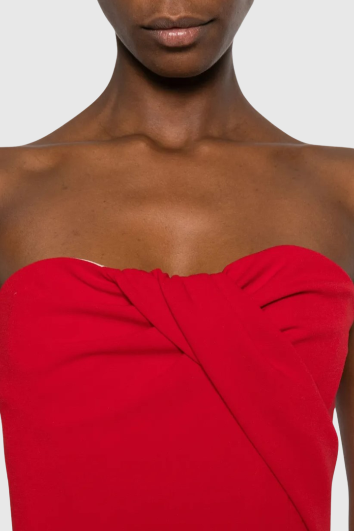 Elevate your style with our Assisi strapless draped mini dress in vibrant red. The luxurious fabric gracefully drapes over your body, while the strapless design adds a touch of elegance. Perfect for any special occasion, this dress will make you stand out in the crowd.