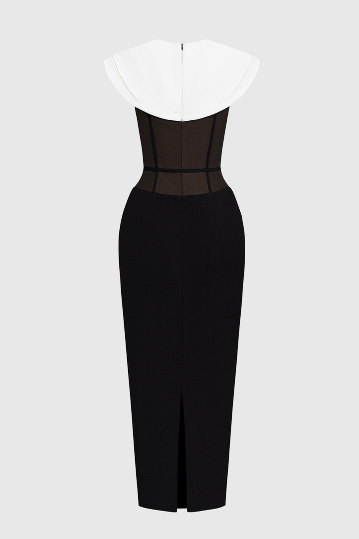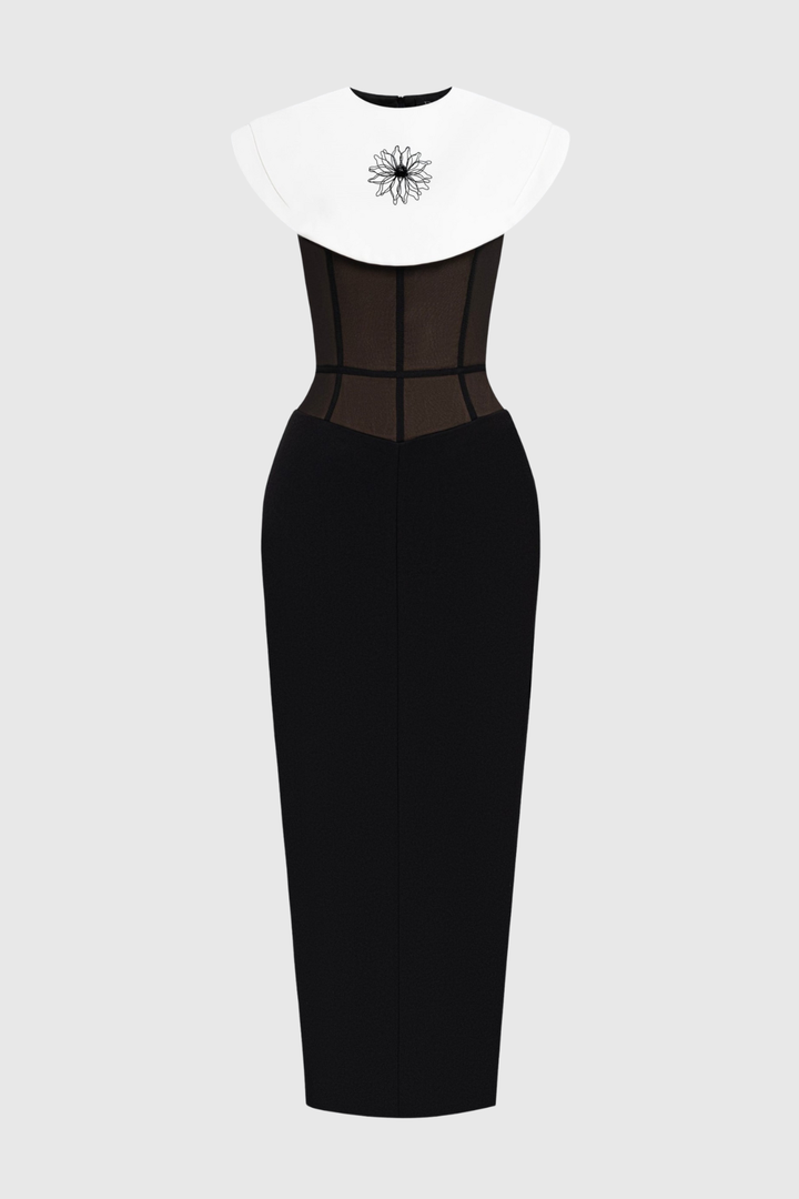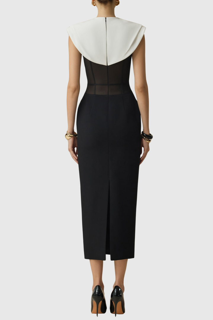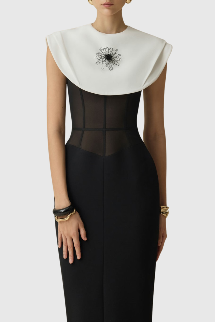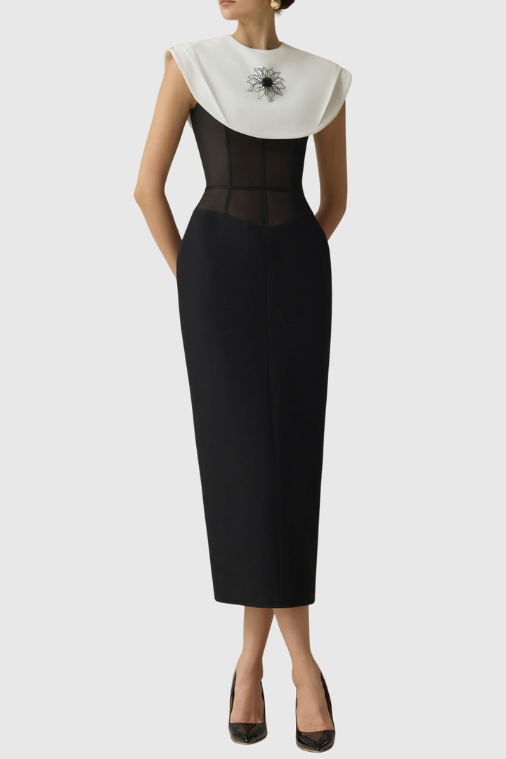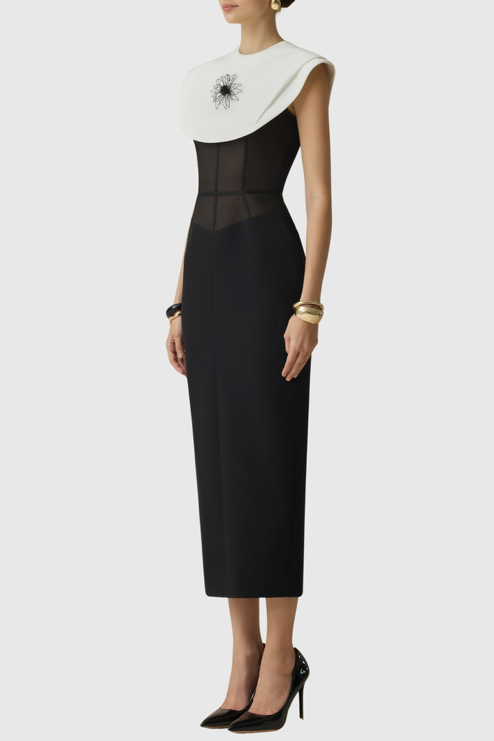 Elevate your wardrobe with this striking Capri Cape Corset Midi Dress, where timeless elegance meets contemporary design. The structured corset bodice provides a flattering silhouette while the dramatic cape detail adds an air of refined sophistication. Cut to a graceful midi length, this piece transitions seamlessly from evening events to upscale occasions. The combination of tailored construction and flowing fabric creates a captivating balance of structure and movement, making it an unforgettable choice for those who appreciate distinctive style.