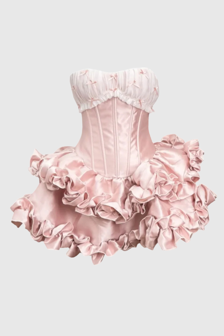 Elevate your evening look with this striking strapless bow corset mini dress. Featuring a structured corset bodice that flatters and defines, paired with a delicate bow detail at the neckline, this piece seamlessly transitions from cocktail events to upscale nights out. The fitted silhouette and mini length create a bold, confident statement. Perfect for those who appreciate refined elegance with a touch of dramatic flair.