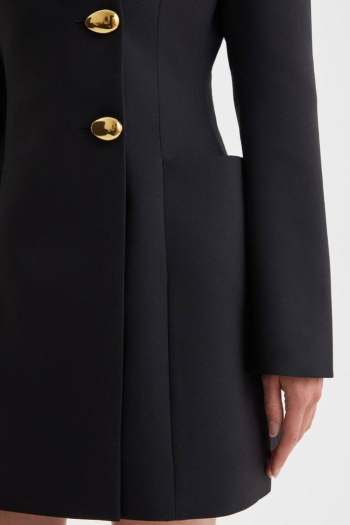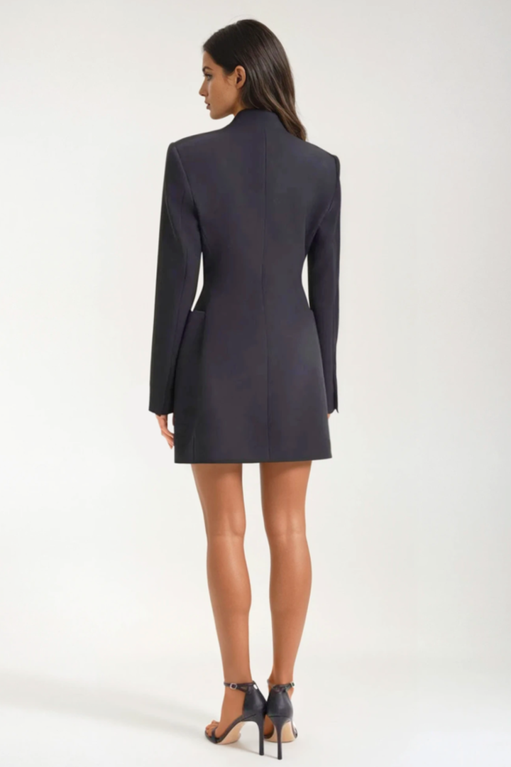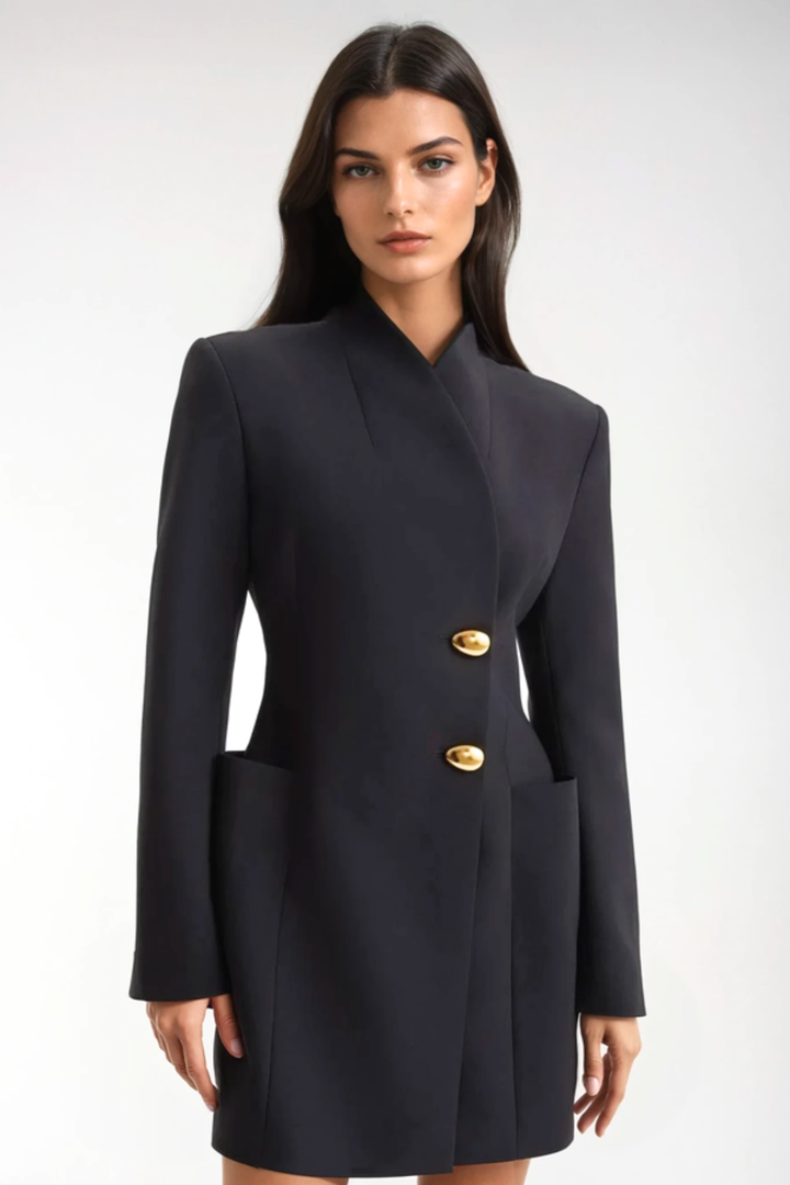 Elevate your wardrobe with the Dorian Buttoned Mini Blazer Dress, a refined piece that seamlessly blends tailored elegance with contemporary style. Featuring a structured blazer silhouette with classic button detailing, this dress delivers polished sophistication for any occasion. The mini length offers a modern edge while maintaining an air of understated luxury. Perfect for transitioning from office to evening, this versatile piece pairs effortlessly with heels, boots, or minimalist accessories for a curated, fashion-forward look.