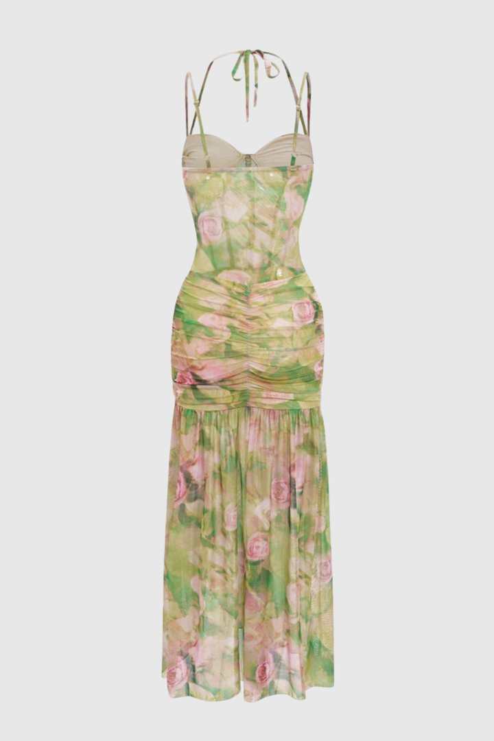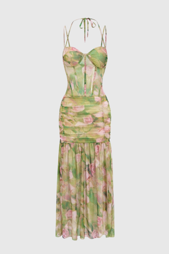 Emika Floral Print Corset Mesh Maxi Dress