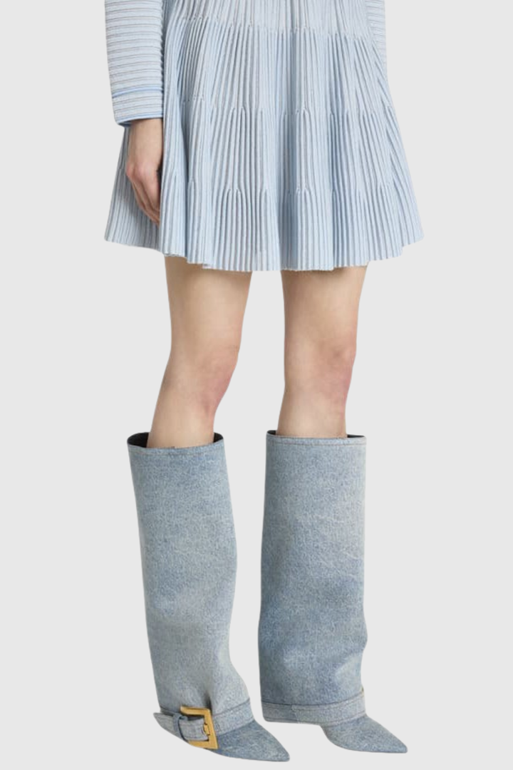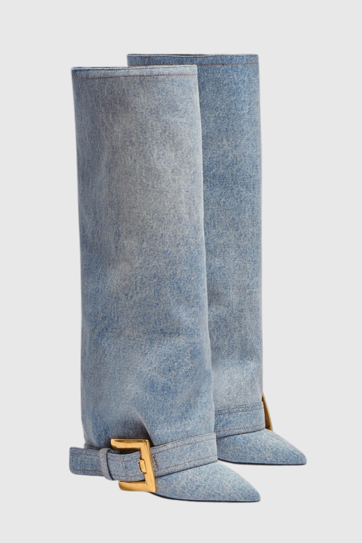 Step into elegance with the Erila Gold Buckle Knee High Boots in Black. These sophisticated boots feature a striking gold buckle accent that elevates any ensemble, from tailored trousers to flowing dresses. The knee-high silhouette offers versatile styling options while the refined design ensures you'll make a polished impression. Crafted for both comfort and style, these boots are an essential addition to any discerning wardrobe.