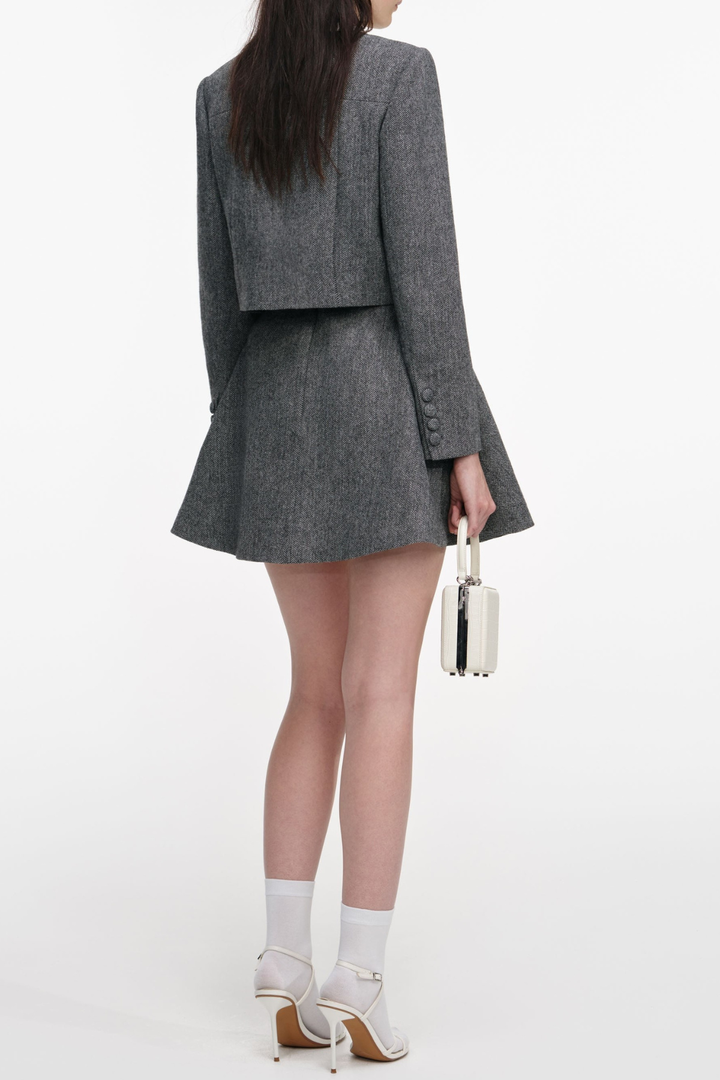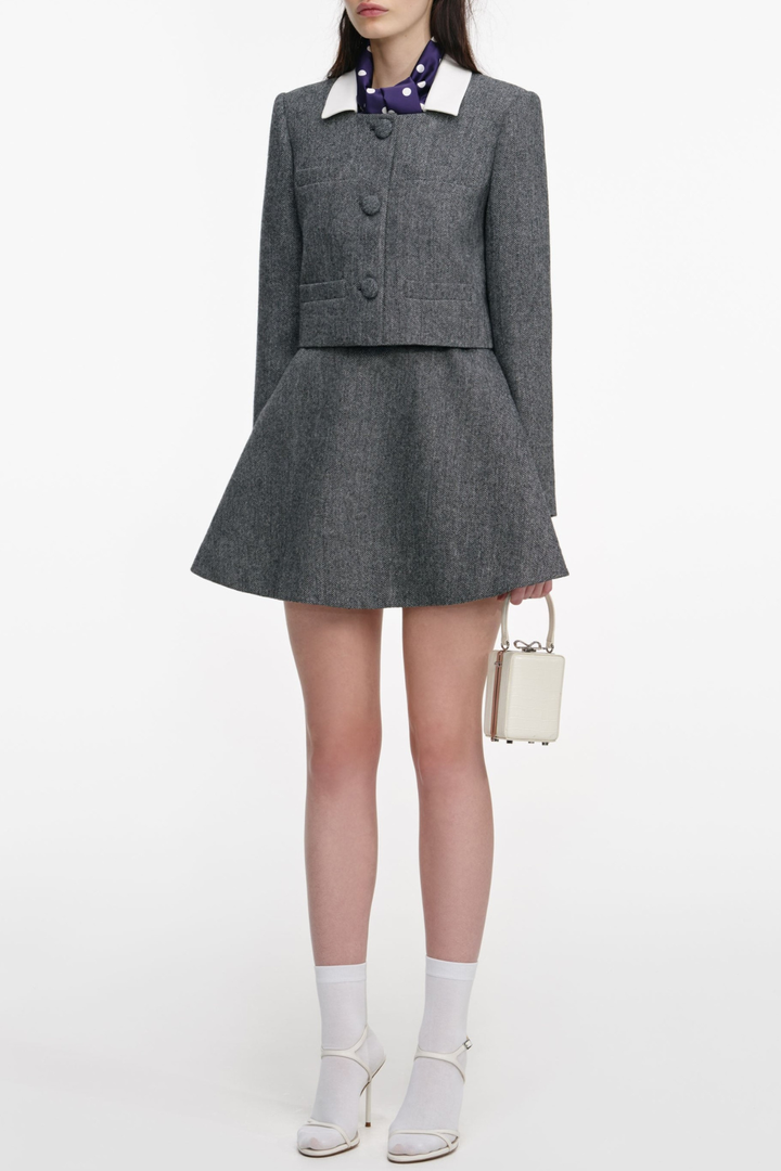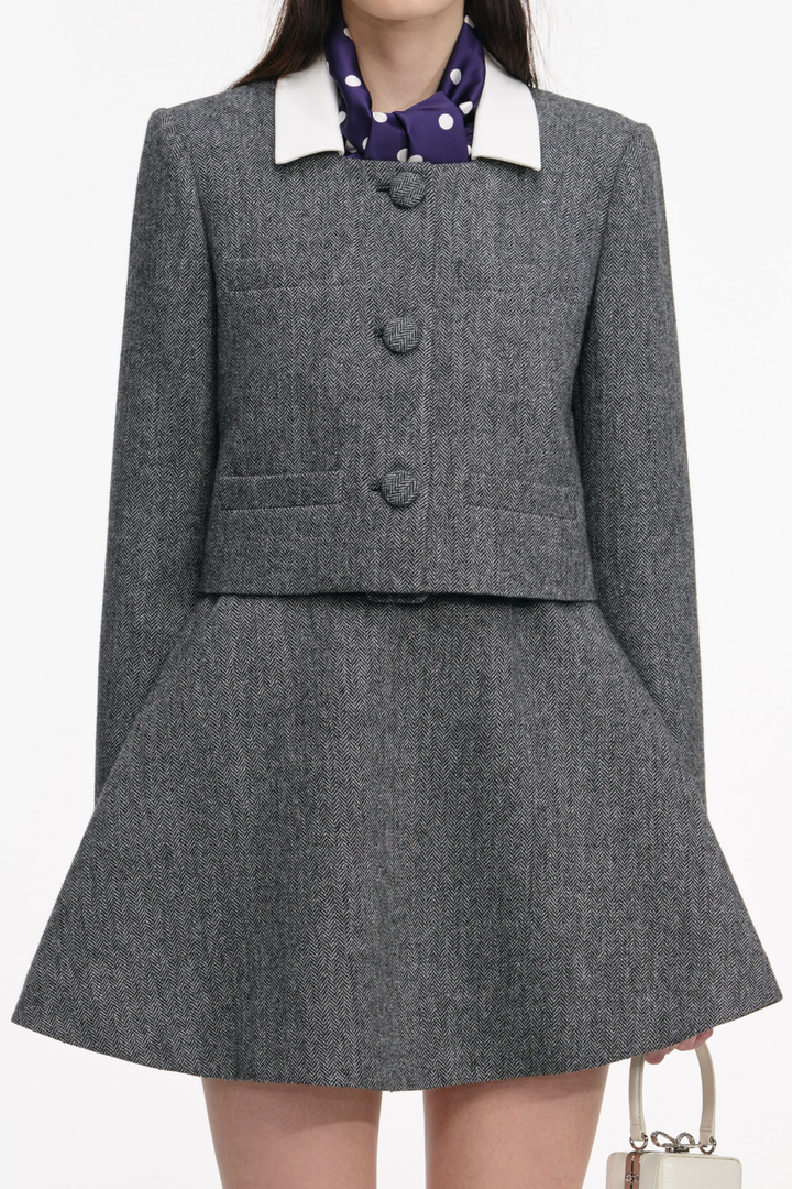 Elevate your wardrobe with the Euryda Herringbone Polka Dot Scarf Jacket, a refined piece that seamlessly blends classic patterns with contemporary style. Crafted with meticulous attention to detail, this jacket features an elegant herringbone weave complemented by delicate polka dot accents, creating visual interest without compromising sophistication. The integrated scarf element adds versatility, allowing you to adjust your look throughout the day. Perfect for layering over dresses or pairing with tailored trousers, this jacket transitions effortlessly from office to evening occasions. A timeless investment piece for the discerning dresser.
