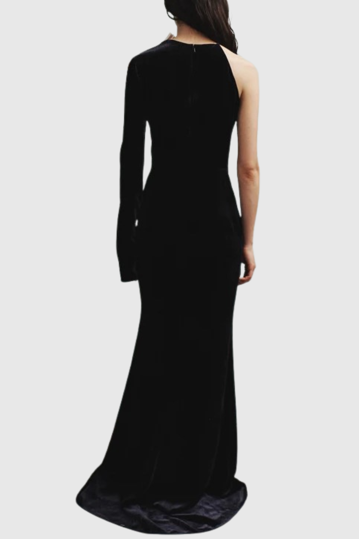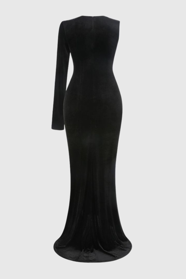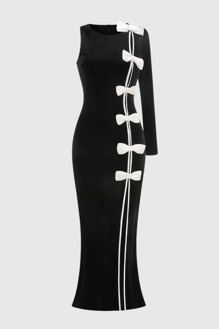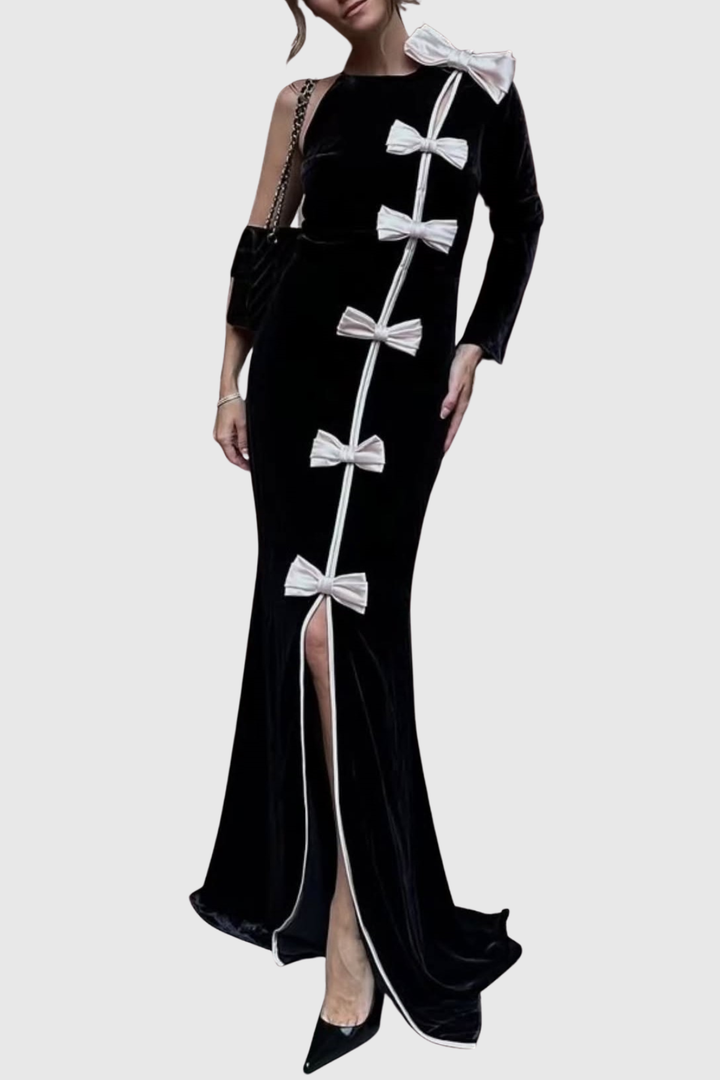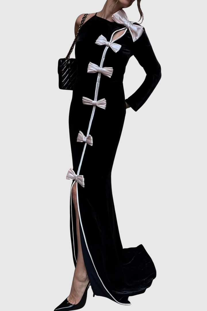 Genevia Bow One Shoulder Velvet Maxi Dress