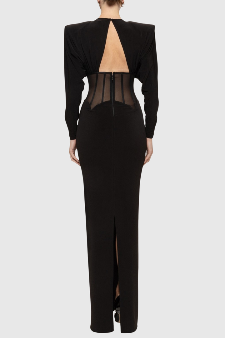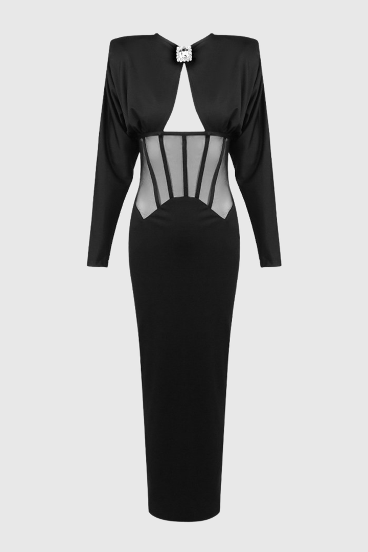 Elevate your evening wardrobe with this striking maxi dress, where architectural corset boning meets contemporary cutout details. The sheer mesh panels create an alluring interplay of coverage and reveal, while the structured bodice provides flattering support and definition. Flowing gracefully to the floor, this piece seamlessly transitions from cocktail events to upscale soirées. Perfect for those who appreciate bold design with refined elegance.