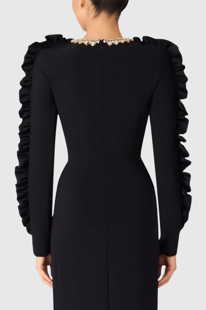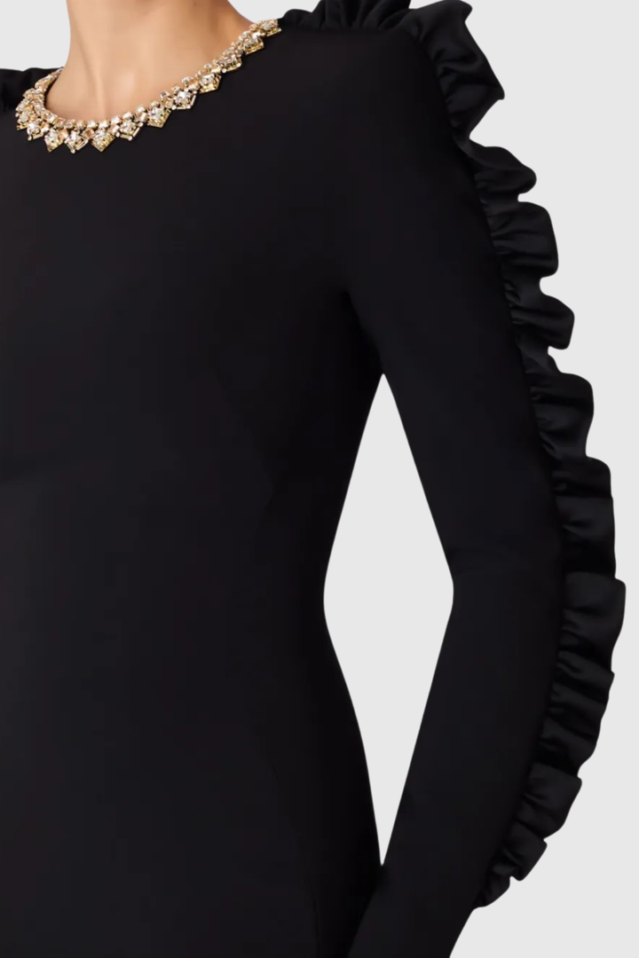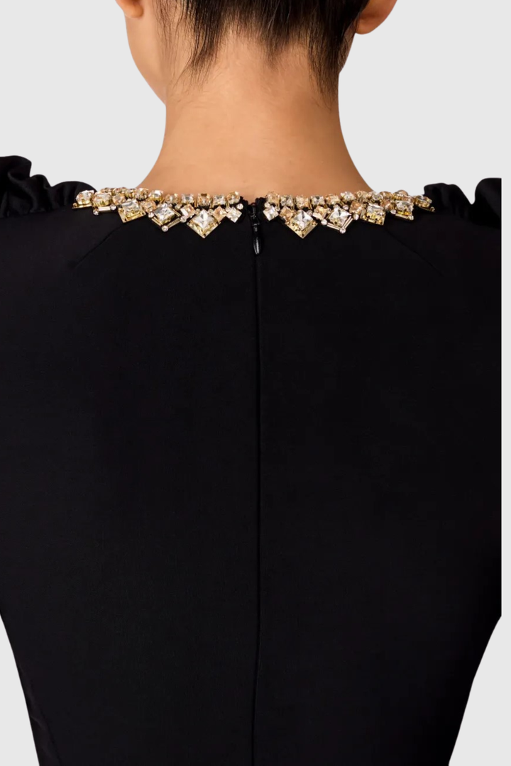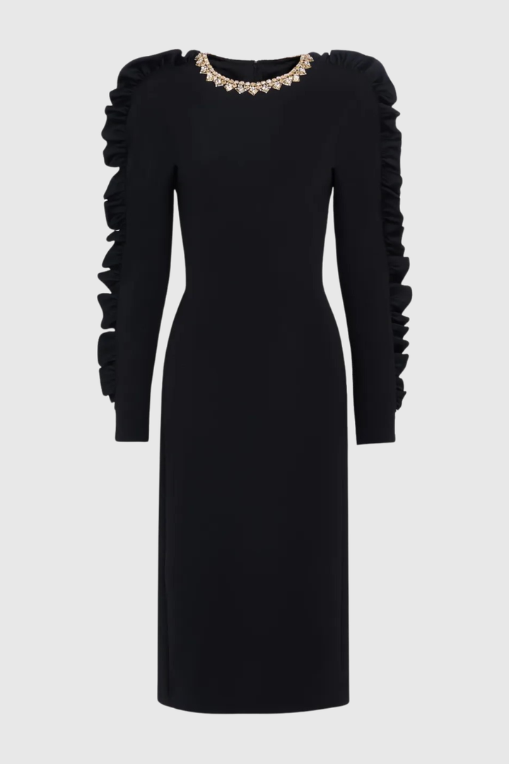 Elevate your wardrobe with this stunning midi dress, featuring an ornate diamante collar that catches the light with every movement. The delicate ruffle sleeves add romantic dimension while maintaining an air of refined elegance. Cut to a flattering midi length, this piece transitions seamlessly from daytime sophistication to evening allure. The intricate beadwork at the neckline serves as a statement focal point, making this dress perfect for special occasions, upscale events, or anyone seeking to make a memorable impression. A timeless investment piece that celebrates both craftsmanship and style.
