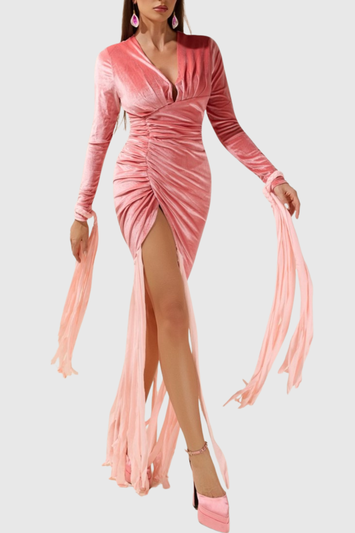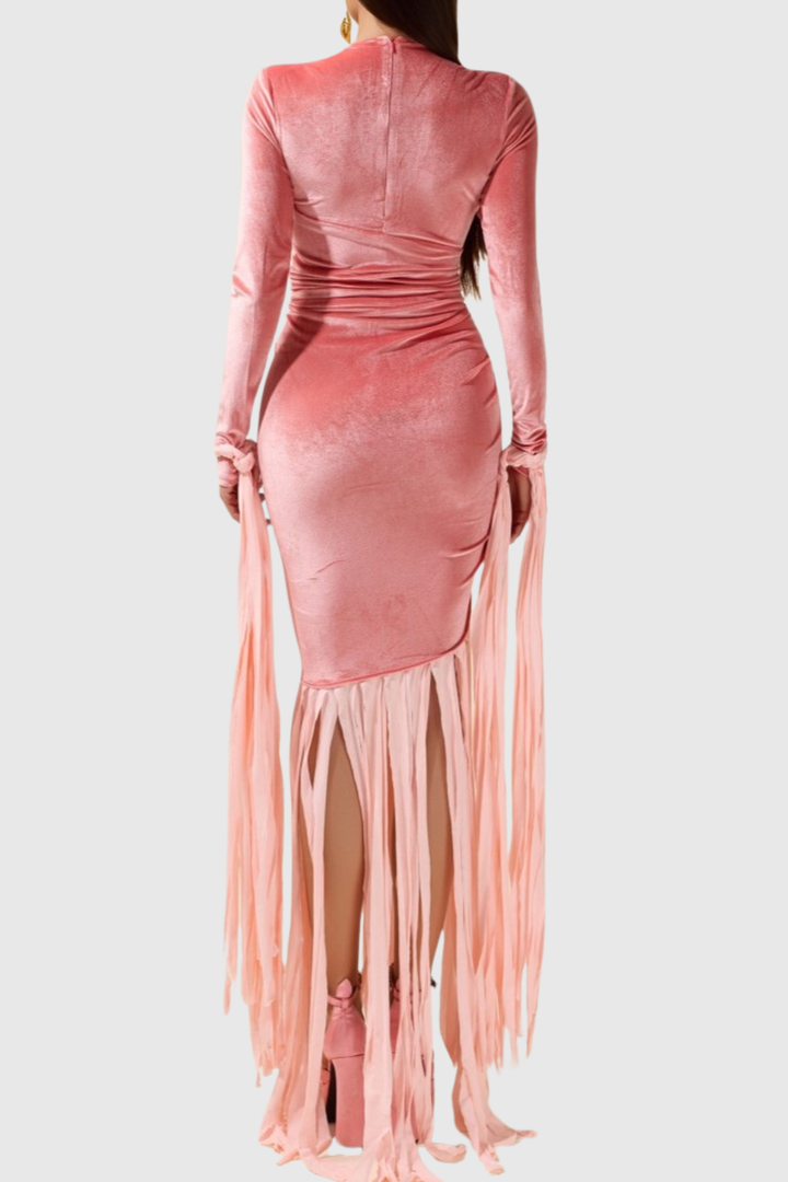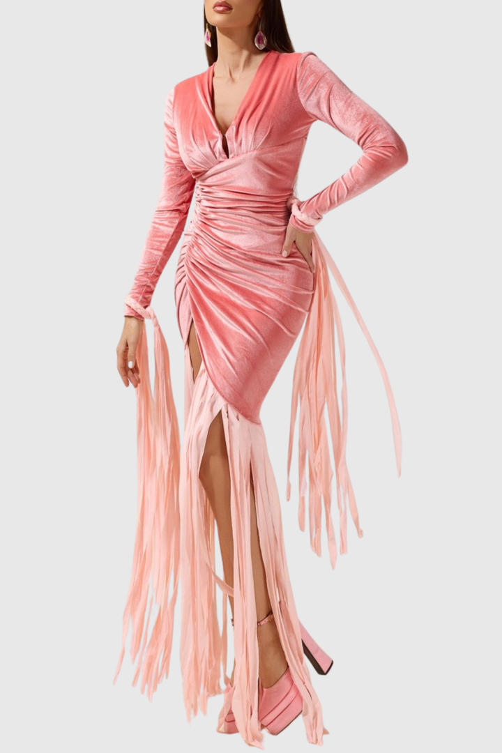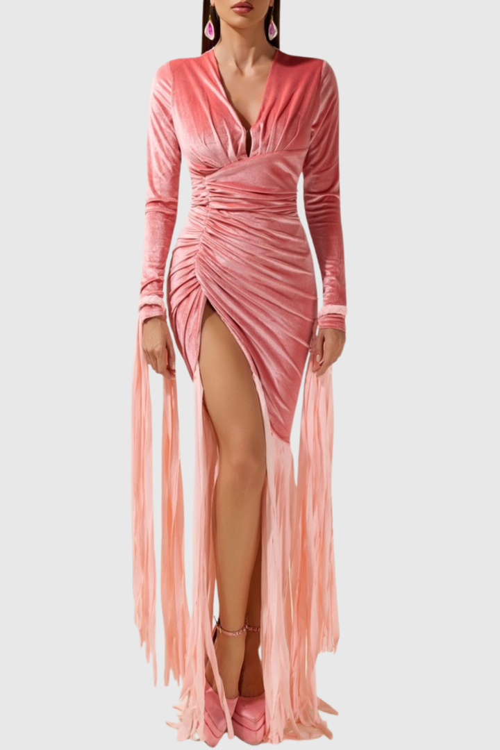 Elevate your evening wardrobe with the Hirst Velvet Ruched Fringed Maxi Dress, a statement piece that seamlessly blends luxury and movement. Crafted from sumptuous velvet, this floor-length gown features expertly ruched detailing that flatters the silhouette while creating dynamic visual interest. Delicate fringe trim adds an unexpected flourish, catching light with every step. Perfect for galas, formal dinners, or upscale celebrations, this dress exudes refined elegance and timeless sophistication.