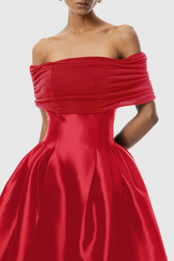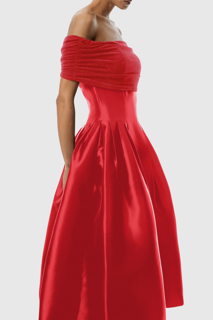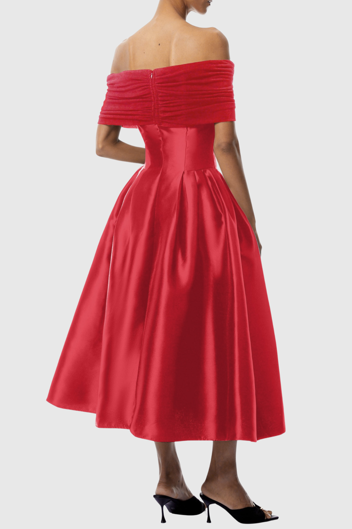 Jesiah Off Shoulder Puff Midi Dress - Red
