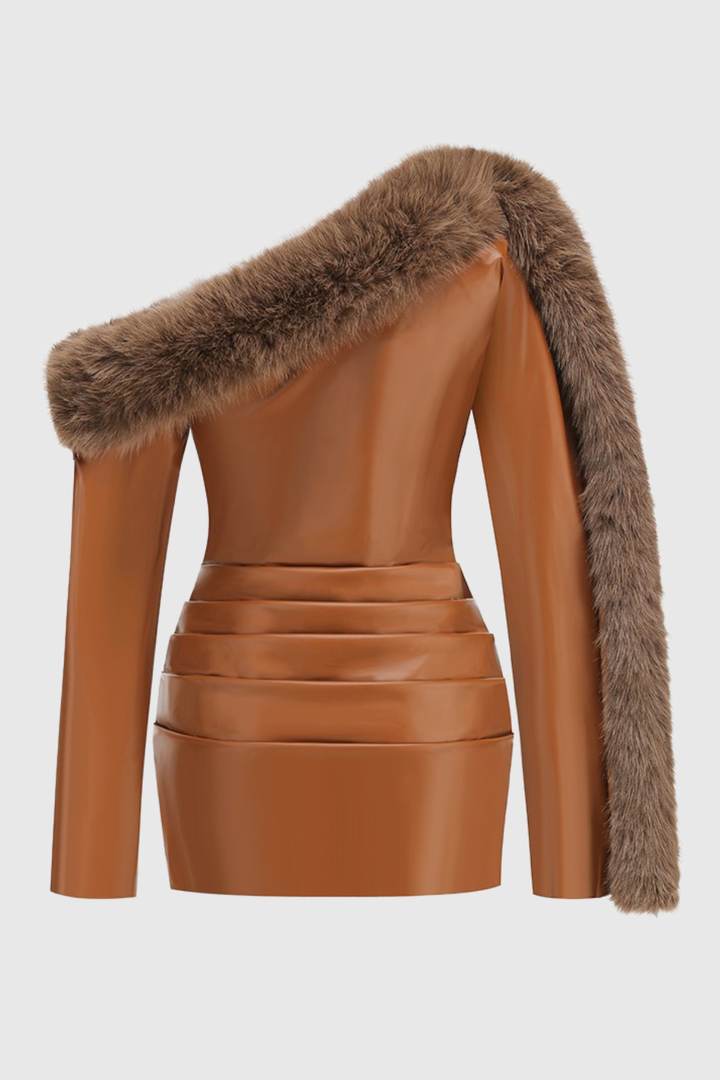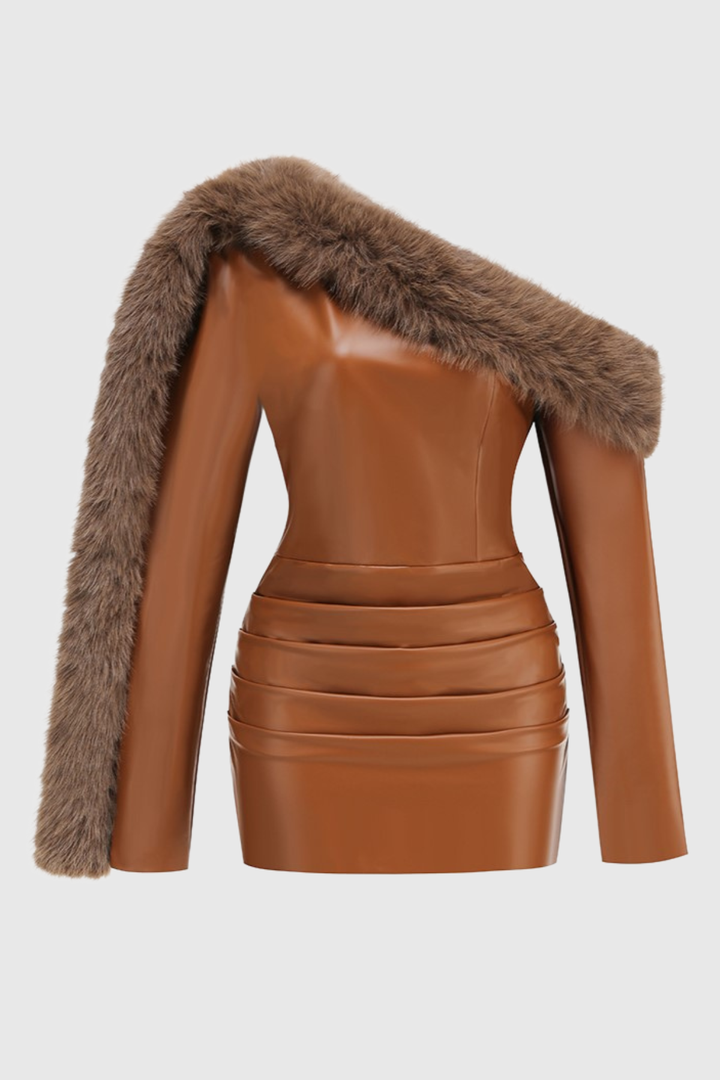 Joura Faux Fur One Shoulder Leather Mini Dress