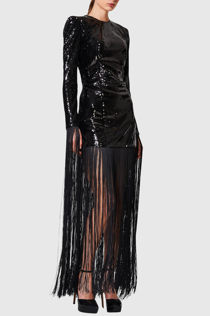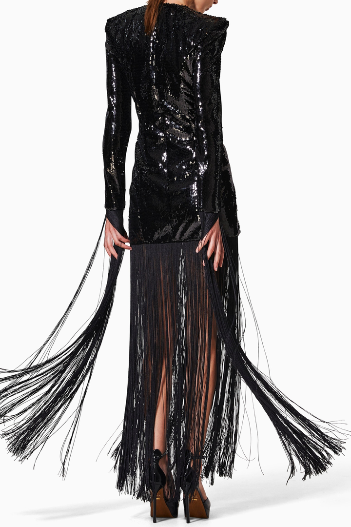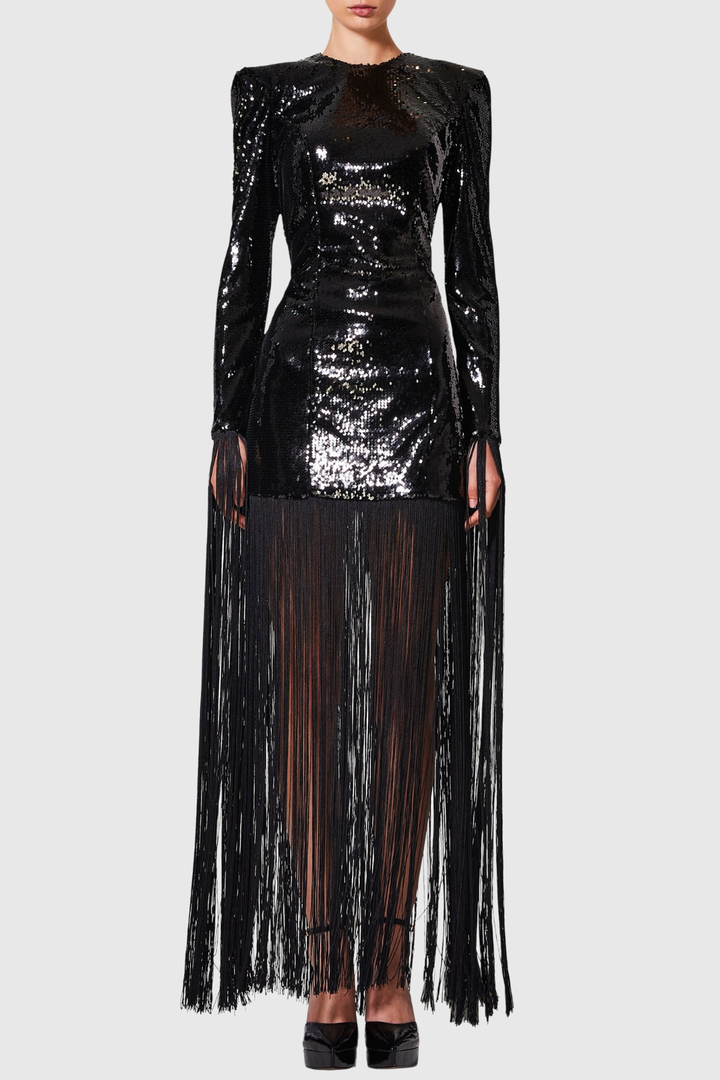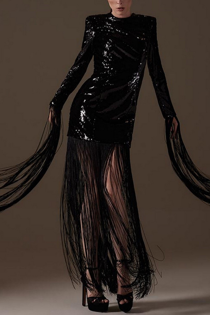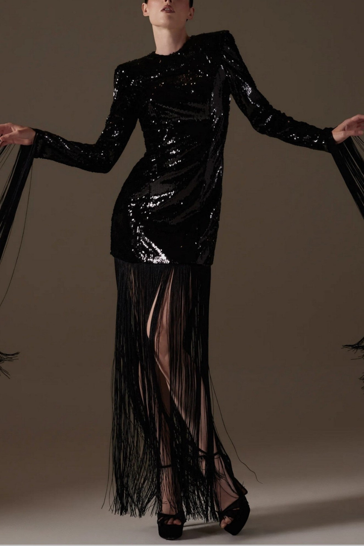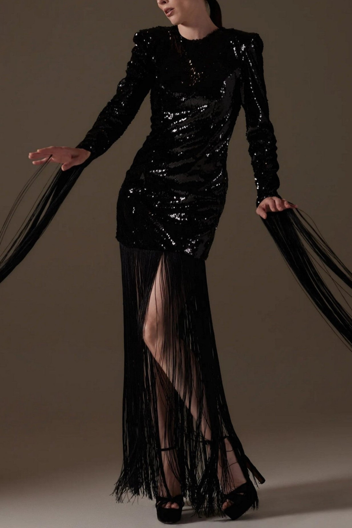 Elevate your evening wardrobe with the Kenzie Sequin Fringe Maxi Dress, a stunning statement piece designed for those who command attention. Adorned with shimmering sequins and cascading fringe details, this floor-length gown combines glamour with movement, creating an enchanting silhouette that catches light with every step. Perfect for galas, formal celebrations, or upscale events, the Kenzie delivers timeless elegance with contemporary flair. The luxurious construction ensures you'll feel as refined as you look, making this dress an investment in unforgettable moments.