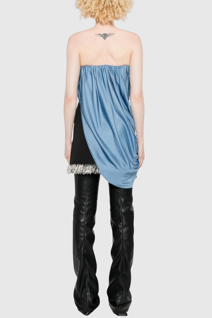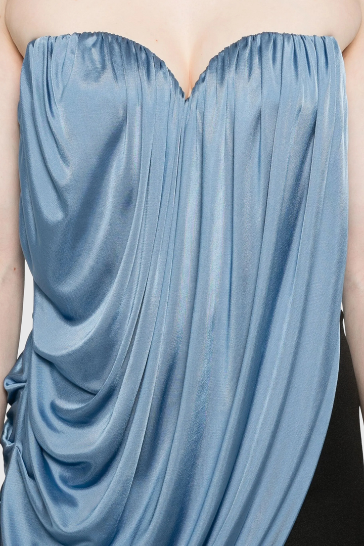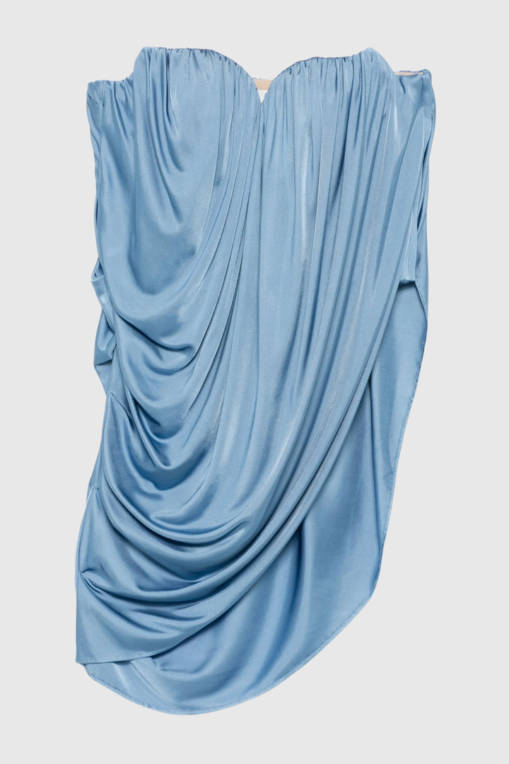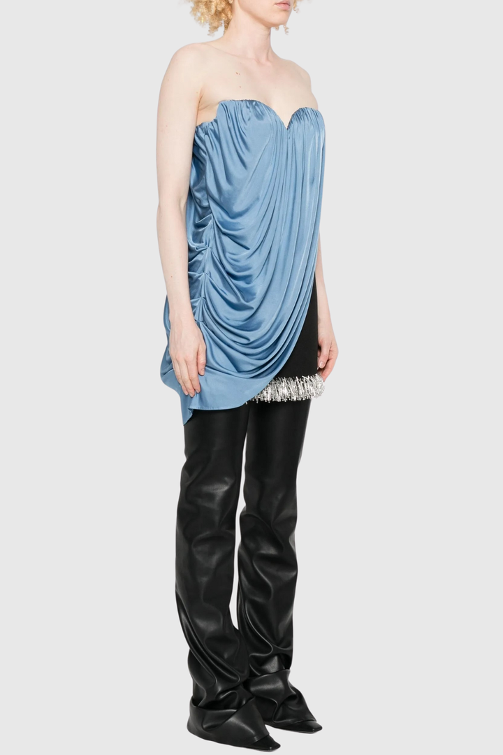Elevate your wardrobe with this striking strapless top, where modern design meets timeless elegance. The asymmetric draped silhouette creates an effortlessly chic aesthetic, flattering the figure with its fluid, artistic construction. Rendered in a rich blue hue, this piece transitions seamlessly from evening events to upscale casual occasions. The strapless neckline offers versatility for layering or standalone styling, while the carefully crafted draping adds dimension and movement. Perfect for those who appreciate refined, contemporary fashion that makes a subtle yet confident statement.
