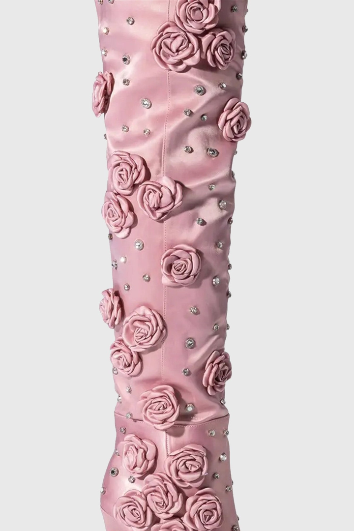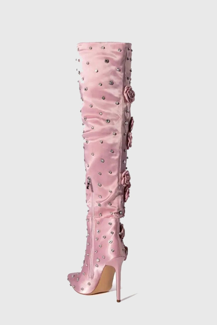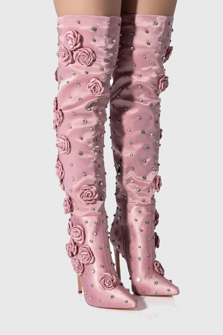 Elevate your footwear collection with the Liza Floral Rhinestone Knee High Boots, where refined elegance meets eye-catching glamour. These stunning boots feature intricate floral detailing adorned with shimmering rhinestones that catch the light with every step. The knee-high silhouette provides a flattering fit while the embellished design makes a bold statement. Perfect for special occasions, evening events, or when you want to add a touch of sparkle to your everyday look. Crafted for those who appreciate distinctive style and aren't afraid to stand out.
