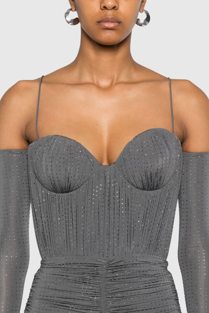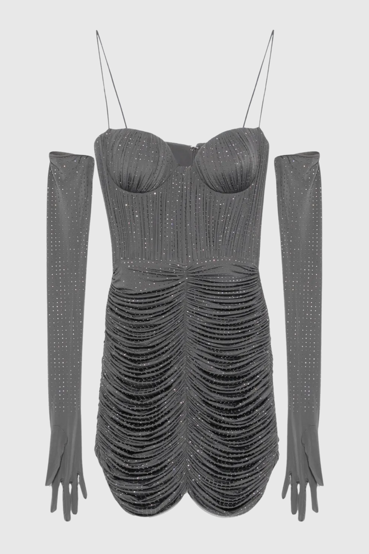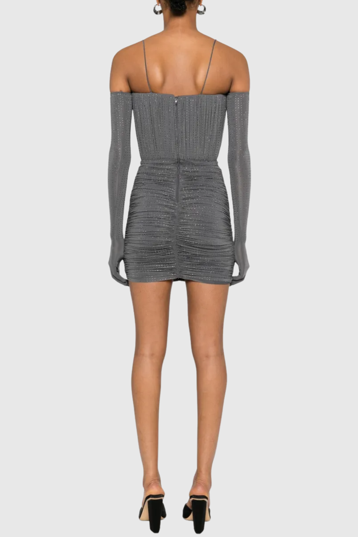 Elevate your evening look with this stunning crystal-embellished mini dress. Featuring intricate ruching that flatters the silhouette and shimmering crystal details that catch the light beautifully, this piece strikes the perfect balance between elegance and allure. The refined construction and luxurious embellishments make it an ideal choice for cocktail events, upscale gatherings, or any occasion where you want to make a memorable impression. A versatile wardrobe essential that transitions seamlessly from night out to special celebrations.