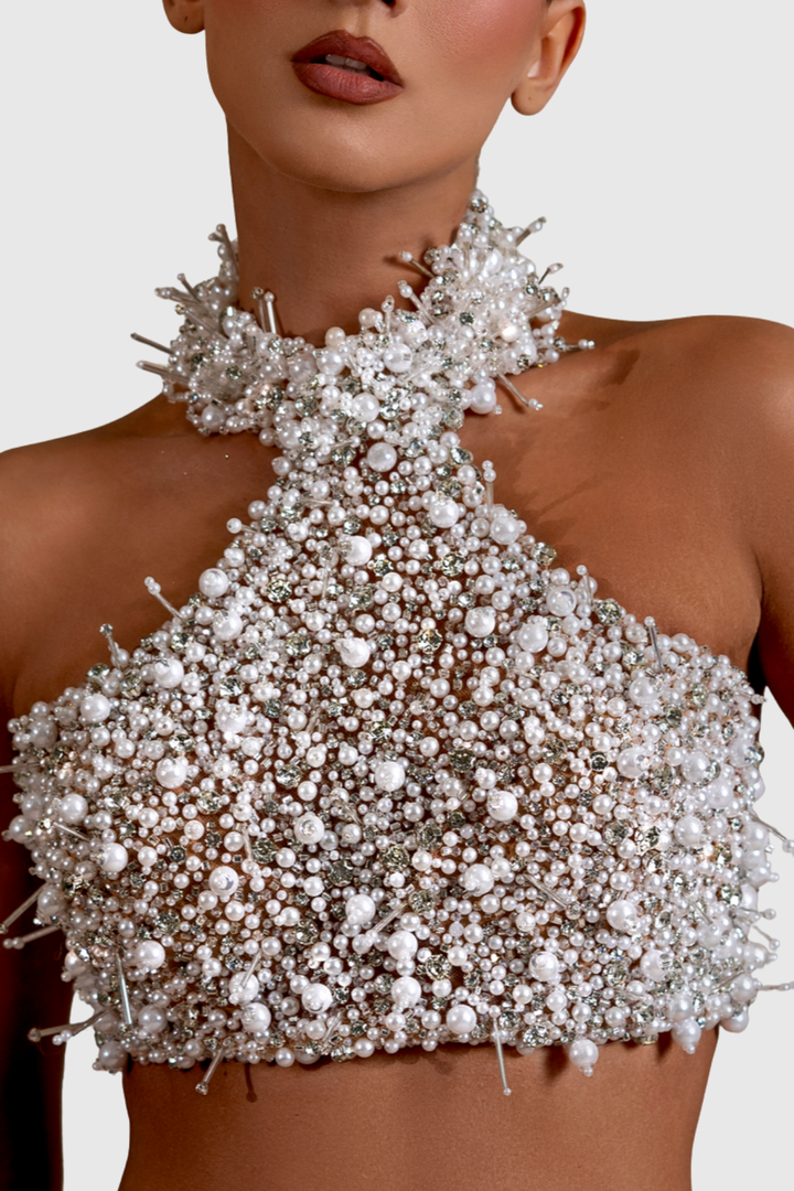 Elevate your evening wardrobe with this refined two-piece ensemble. The crystalline pearl top catches light beautifully, creating an ethereal shimmer that commands attention, while the delicate mesh skirt adds an air of understated elegance. Perfect for cocktail events, upscale dinners, or any occasion where you want to make a graceful impression. The sophisticated pairing of lustrous textures creates a cohesive look that feels both modern and timeless, allowing you to transition seamlessly from day to night with effortless style.