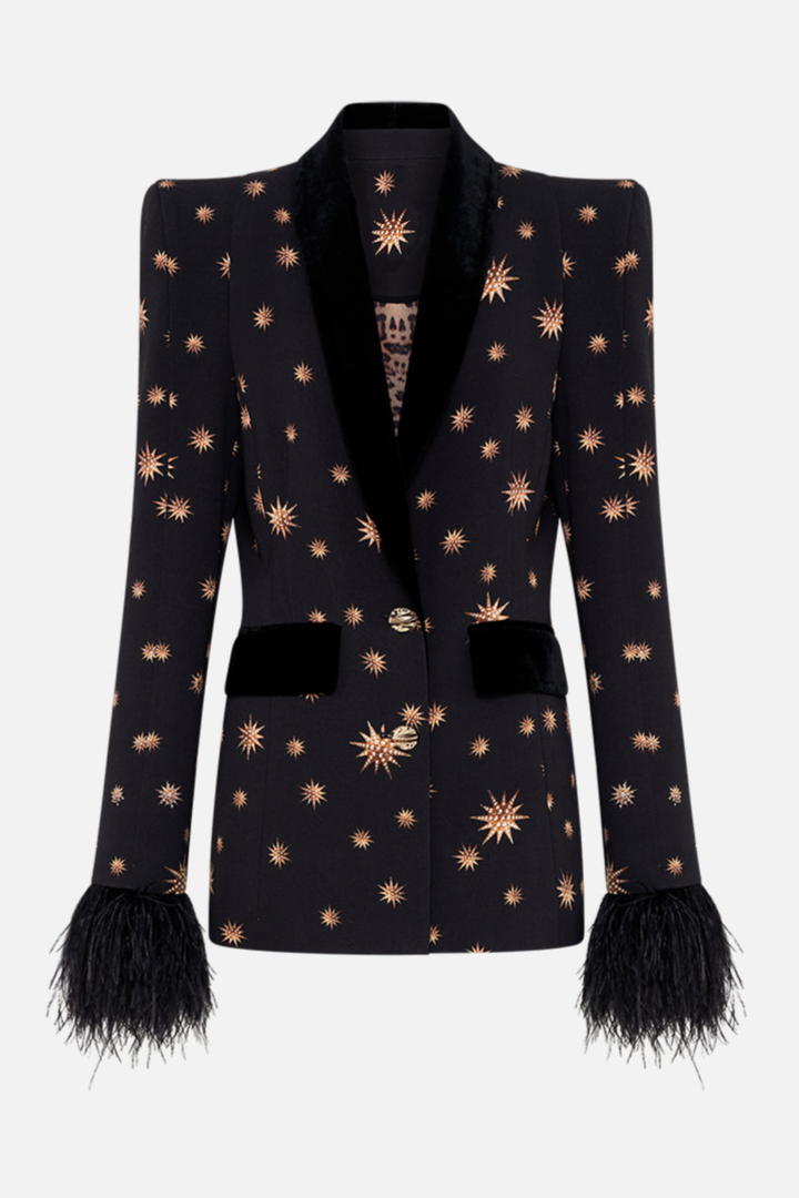Elevate your wardrobe with this striking two-piece ensemble featuring intricate star embroidery and luxurious feather detailing. The tailored blazer pairs seamlessly with coordinating pants, creating a polished silhouette perfect for upscale events, professional settings, or fashion-forward occasions. Crafted with meticulous attention to detail, this set combines contemporary design with timeless elegance, allowing you to make a confident statement wherever you go.