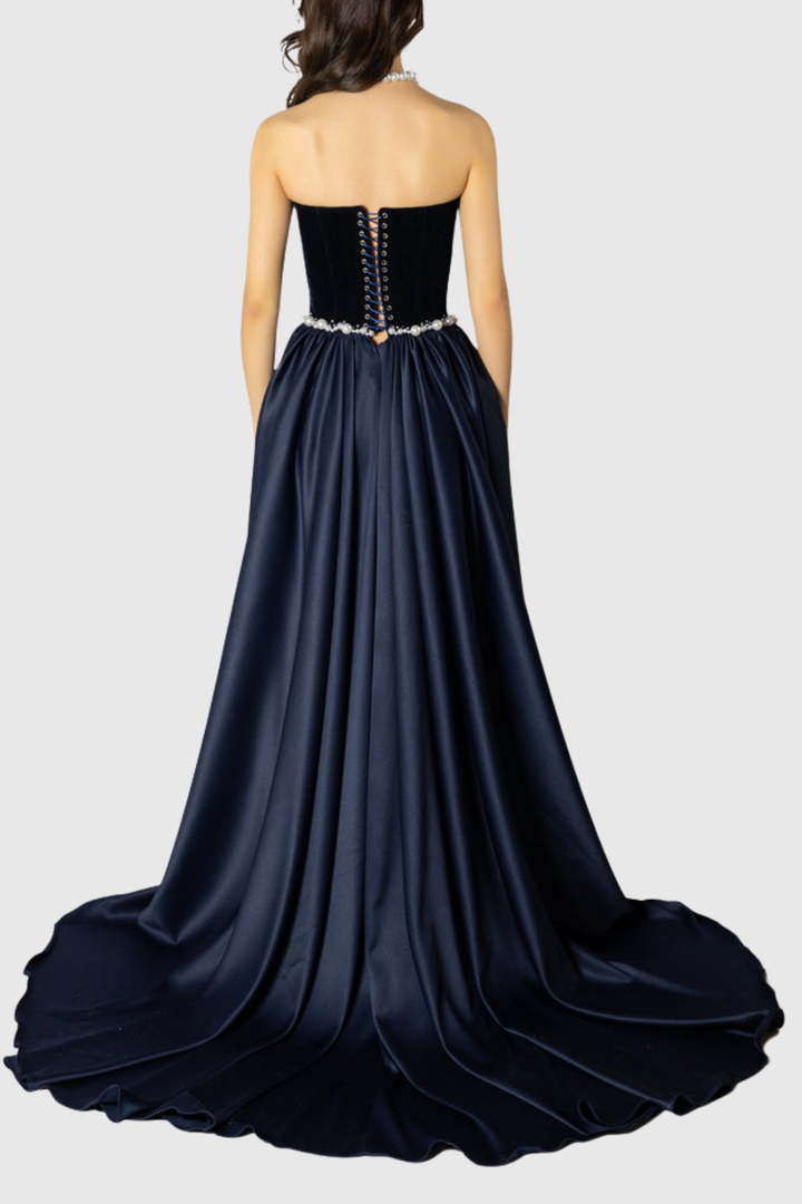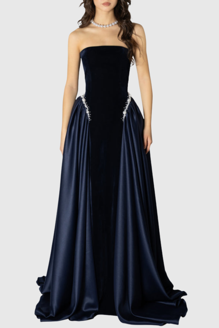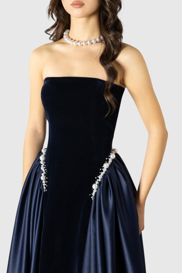Moloka Strapless Velvet Pearl Embellished Maxi Dress - Navy