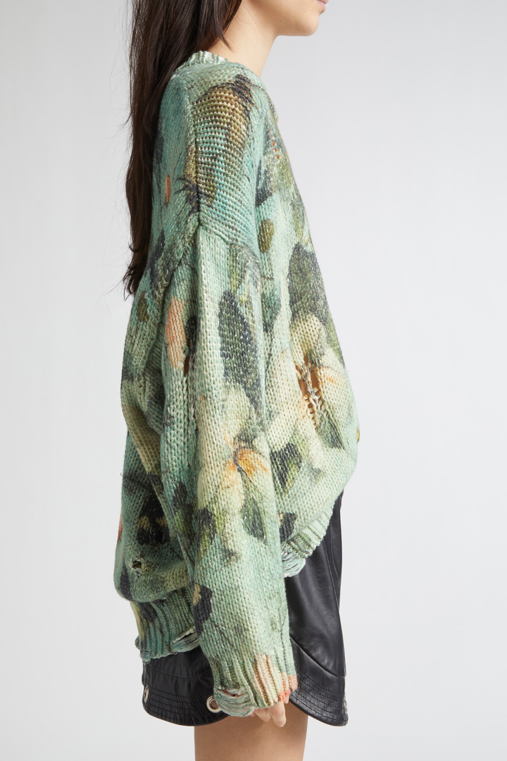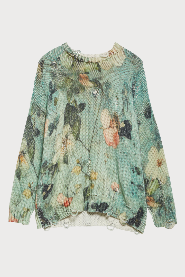 Omria Floral Print Distressed Sweater - Green