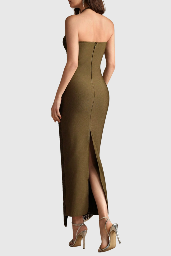 Oriana Halter Fringe Maxi Bandage Dress - Green