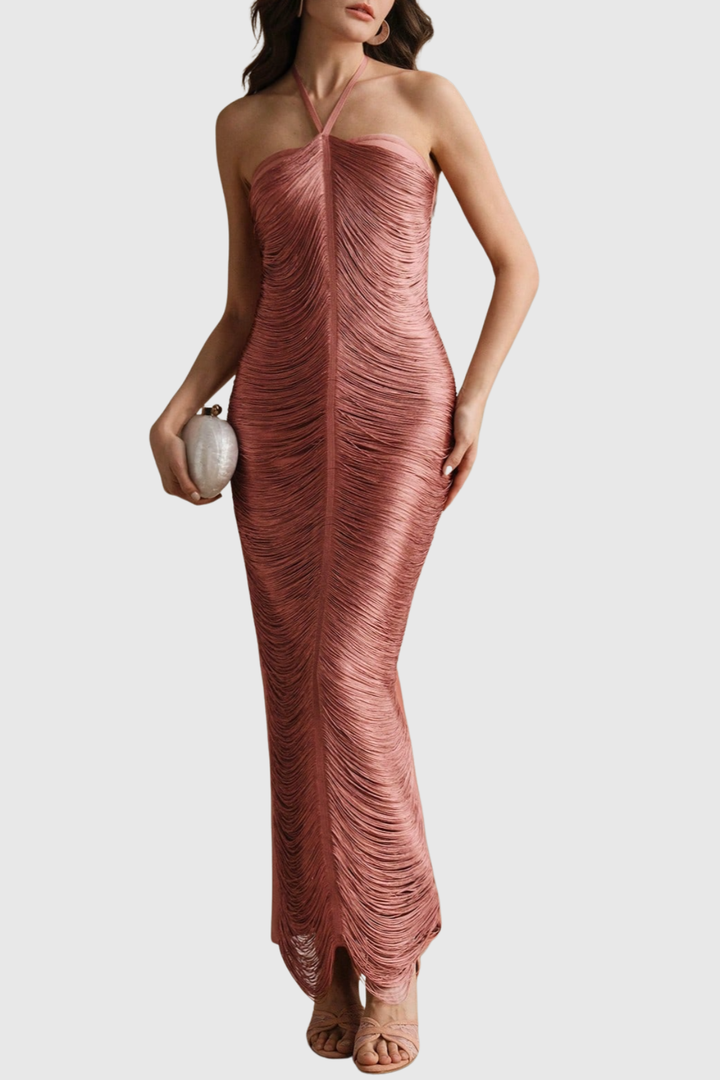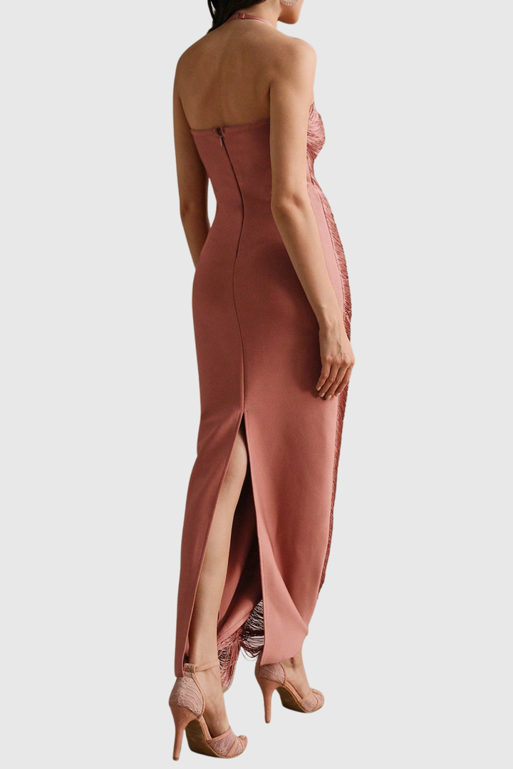 Oriana Halter Fringe Maxi Bandage Dress - Pink