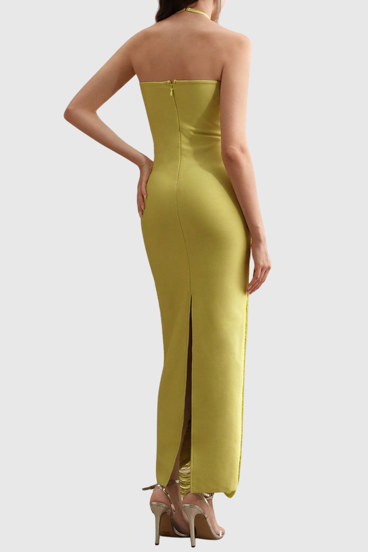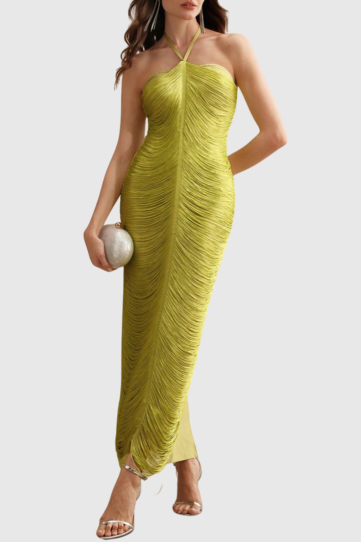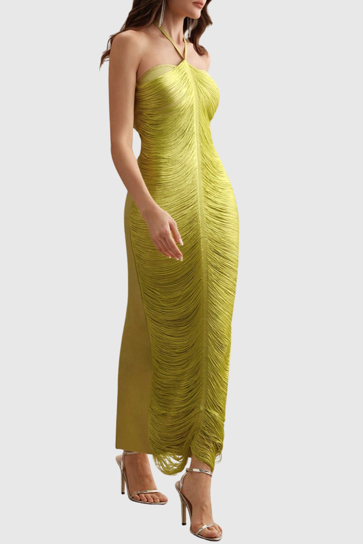 Oriana Halter Fringe Maxi Bandage Dress - Yellow