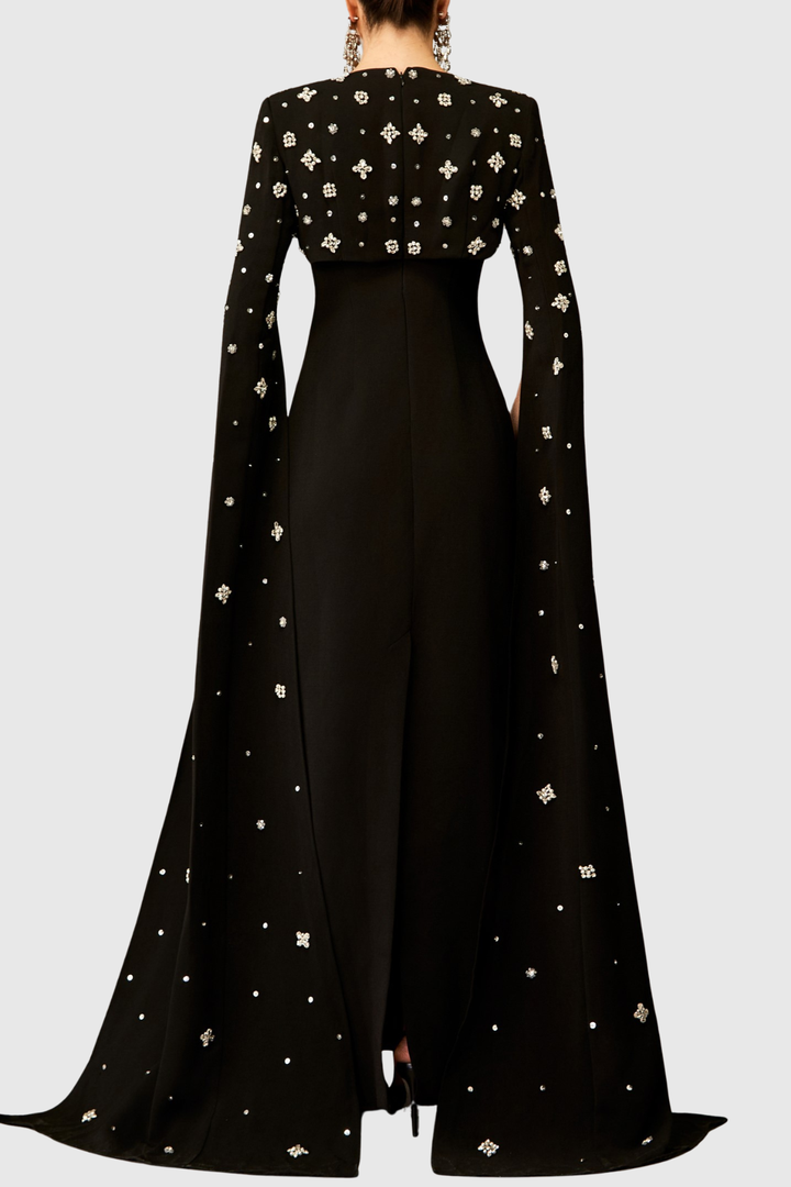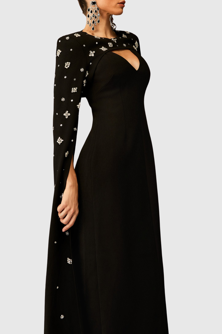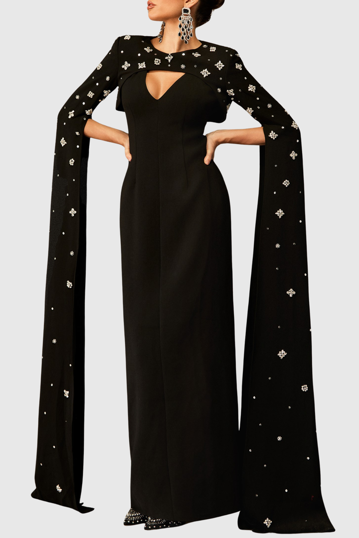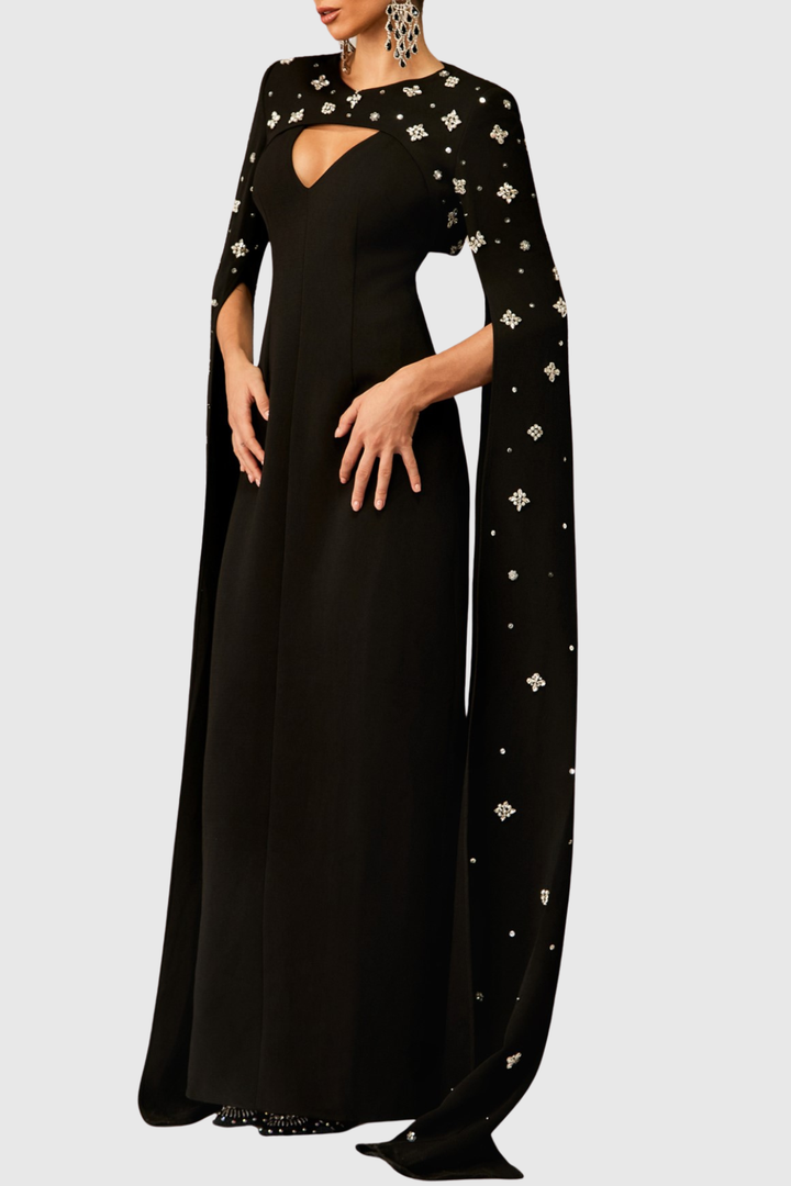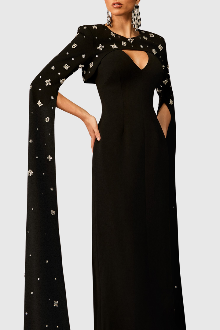 Oslo Crystal Embellished Heart Cutout Cape Sleeve Maxi Dress - Black