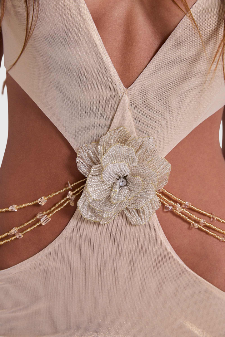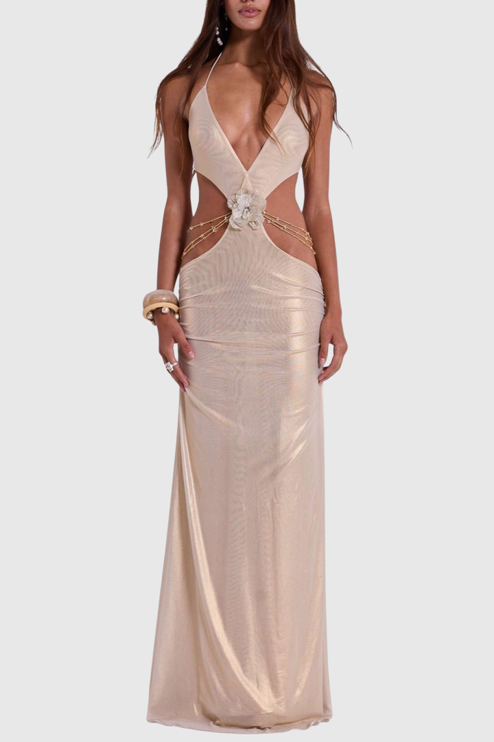 Elevate your evening wardrobe with this stunning maxi dress, where delicate floral embellishments meet modern design. The halter neckline provides elegant support while strategic cutouts add contemporary flair and visual interest. Crafted for those who appreciate refined style, this floor-length silhouette flows gracefully and works beautifully for formal events, upscale dinners, or special occasions. The intricate floral detailing catches light beautifully, ensuring you make a memorable impression. Perfect for the discerning woman seeking a dress that balances sophistication with bold, fashion-forward elements.