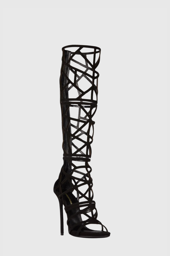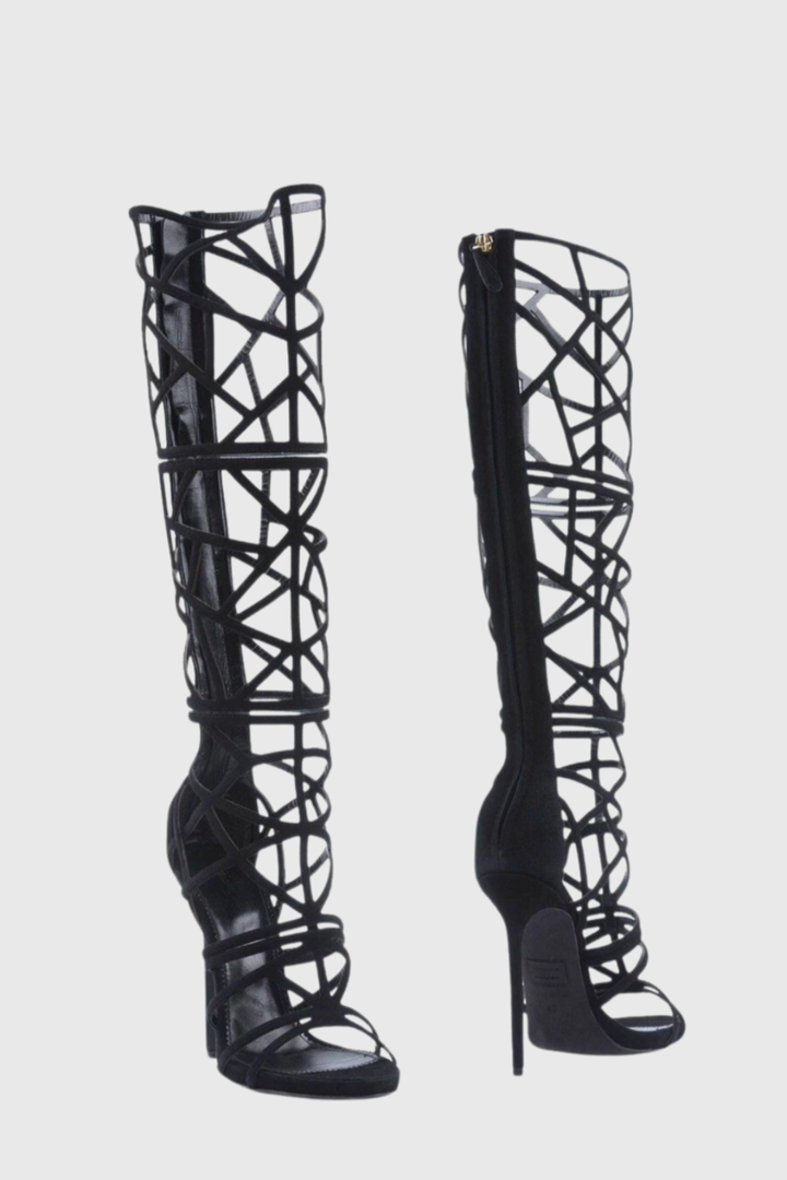 Elevate your footwear collection with the Parsa Black Cage Knee High Boots, a striking fusion of edgy design and refined elegance. Featuring an intricate cage detailing that wraps around the shaft, these boots command attention while maintaining a polished aesthetic. The knee-high silhouette provides versatile styling options, seamlessly transitioning from evening wear to contemporary casual looks. Crafted with meticulous attention to detail, these boots deliver both visual impact and wearable sophistication for the discerning fashion enthusiast.