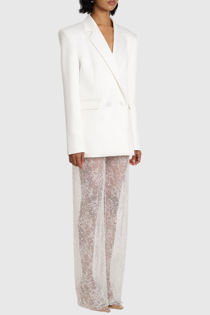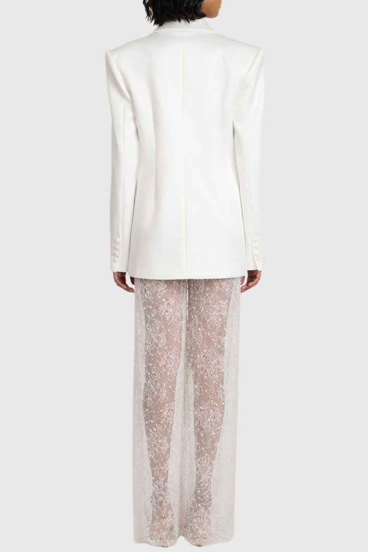 Elevate your wardrobe with the Pelaga Blazer & Lace Pants Set, a refined two-piece ensemble designed for the modern professional. The tailored blazer delivers structured elegance with a polished silhouette, while delicate lace detailing on the pants adds an unexpected touch of femininity and sophistication. Perfect for boardroom meetings, evening events, or elevated everyday styling, this set seamlessly transitions from day to night. The combination of crisp tailoring and intricate lace creates a distinctive look that balances power and grace, making it an essential investment piece for those who appreciate timeless style with contemporary flair.