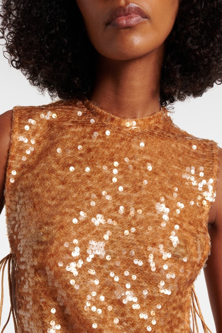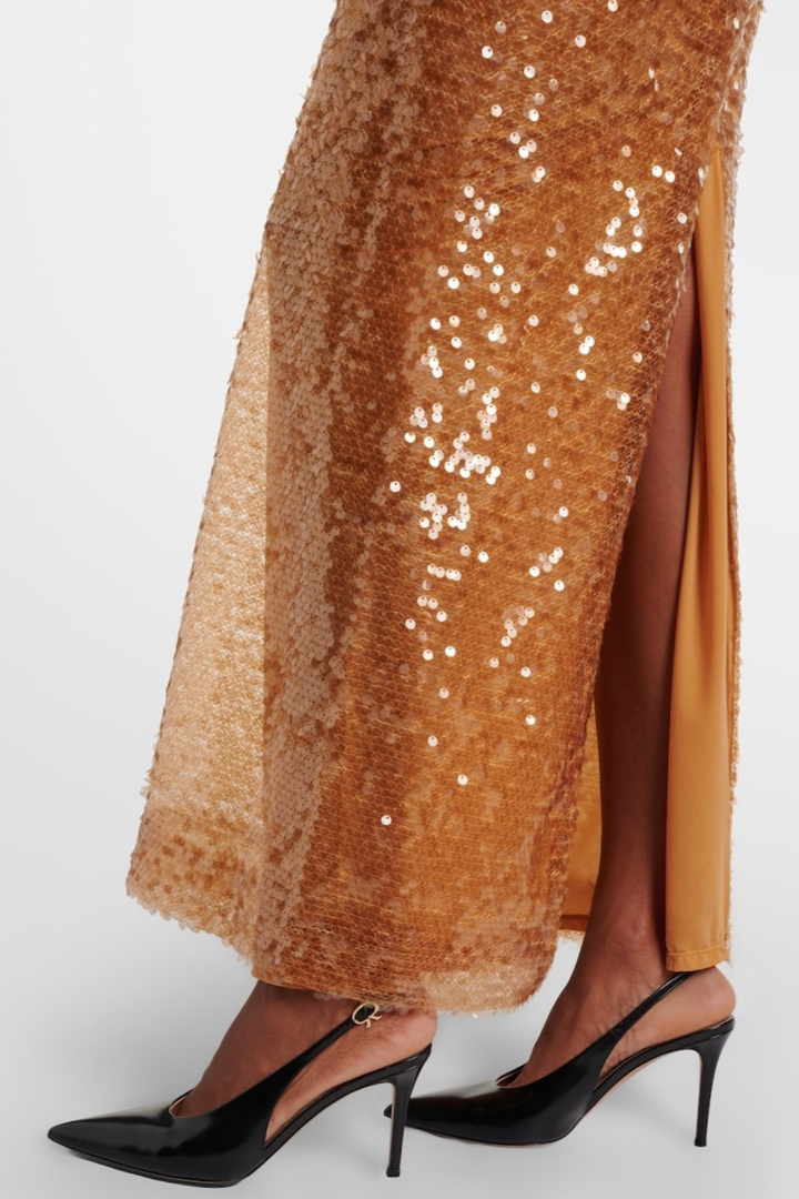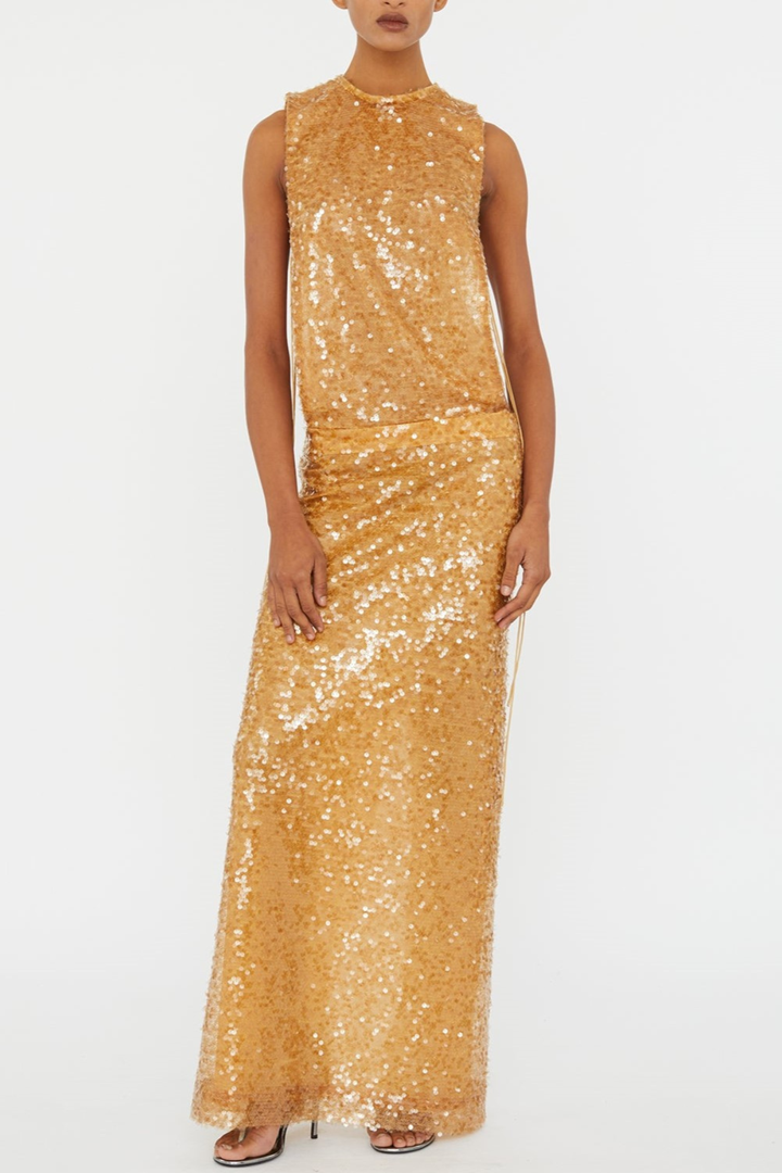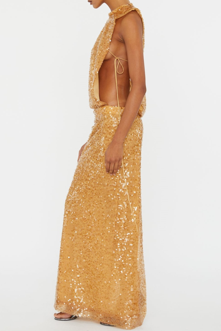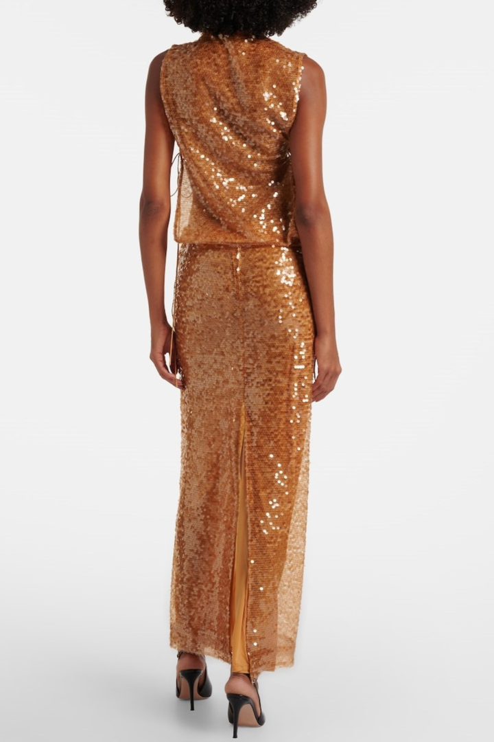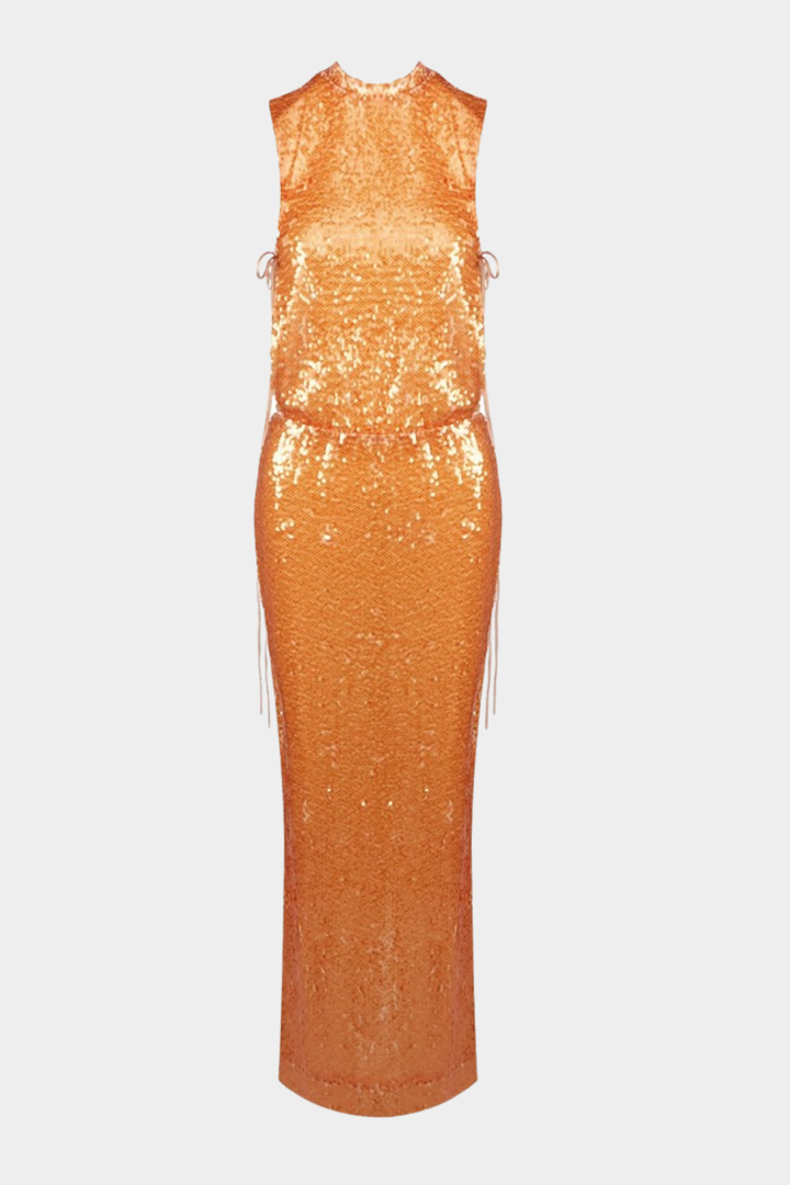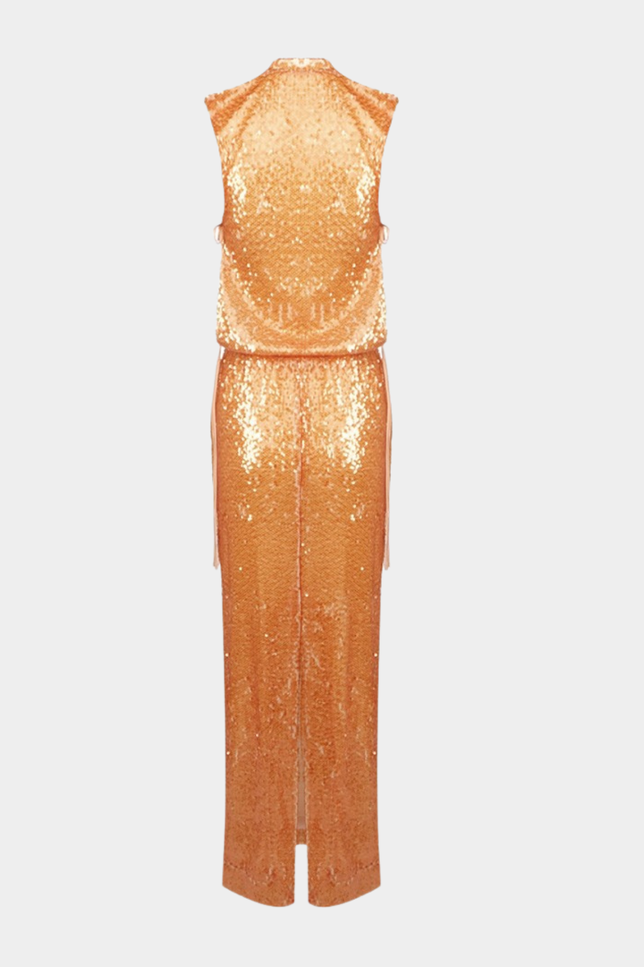 The Pipita Sequin Sleeveless Maxi Dress offers a refined silhouette accentuated by shimmering sequins that catch the light elegantly. Designed without sleeves, it provides a sleek, elongating fit perfect for formal occasions. This dress blends timeless glamour with modern sophistication, making it an effortless choice for evening events where style and poise are paramount.