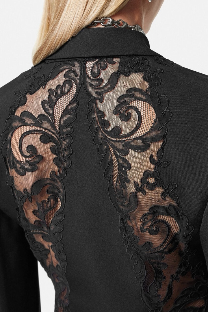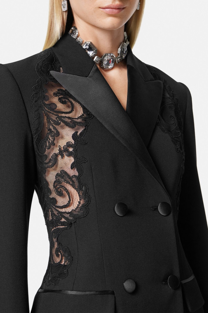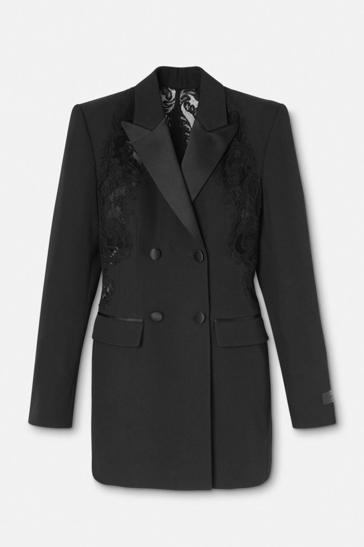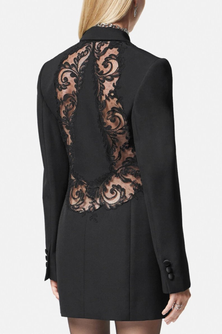 Elevate your wardrobe with the Pisana Lace-embellished Double-breasted Mini Blazer Dress. This refined piece combines classic tailoring with delicate lace accents, creating a striking balance of strength and femininity. Its double-breasted silhouette offers a polished fit, while the mini length adds a modern edge. Perfect for sophisticated occasions, this dress delivers effortless elegance and confident style.