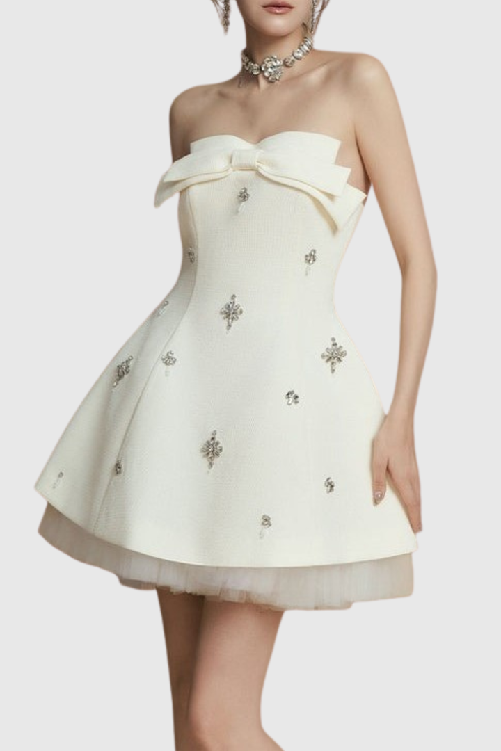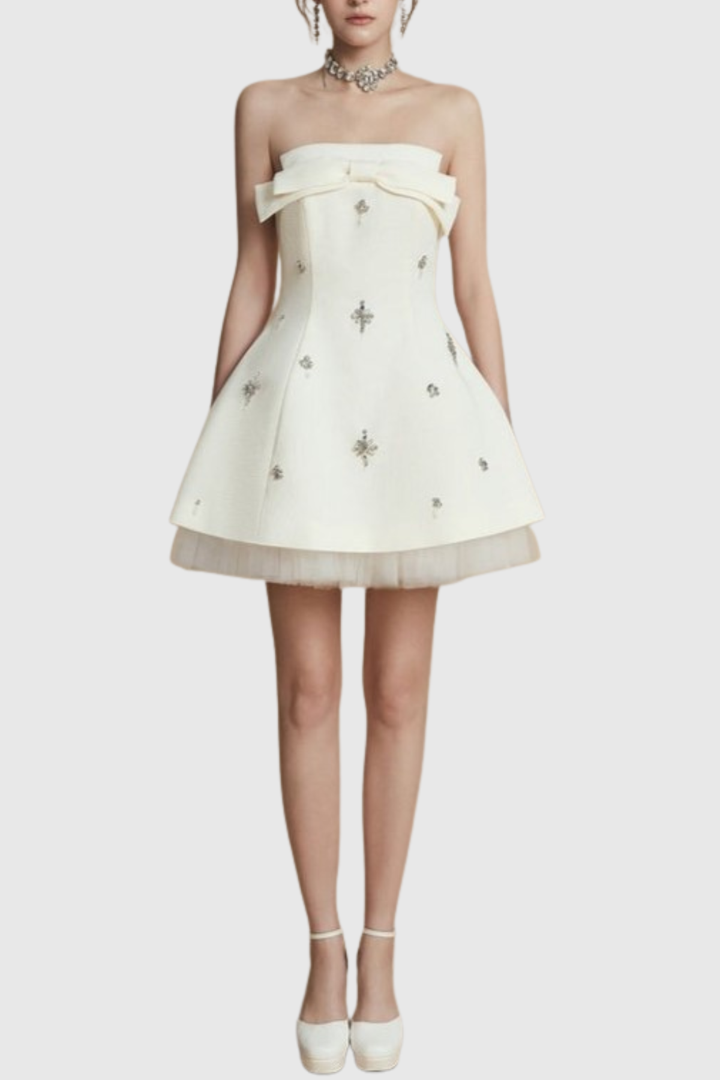 Elevate your evening look with the Raiven Bow Crystal Embellished Mini Dress, a striking piece that seamlessly blends elegance with contemporary flair. Featuring delicate crystal embellishments that catch the light beautifully and a refined bow detail, this mini dress exudes understated luxury. The tailored silhouette flatters the figure while the shimmering accents add just the right amount of glamour for special occasions, cocktail events, or upscale gatherings. Perfect for those who appreciate refined sophistication with a modern edge.