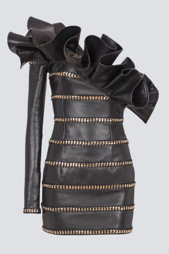 Elevate your evening look with this striking one-shoulder design that commands attention. The asymmetric cut creates an unexpected silhouette, while luxurious leather construction delivers timeless sophistication. Delicate ruffles add movement and dimension, transforming a classic mini into a statement piece. Perfect for cocktail events or upscale nights out, this dress balances bold styling with refined elegance. The structured leather ensures a polished appearance that transitions seamlessly from dinner to dancing.