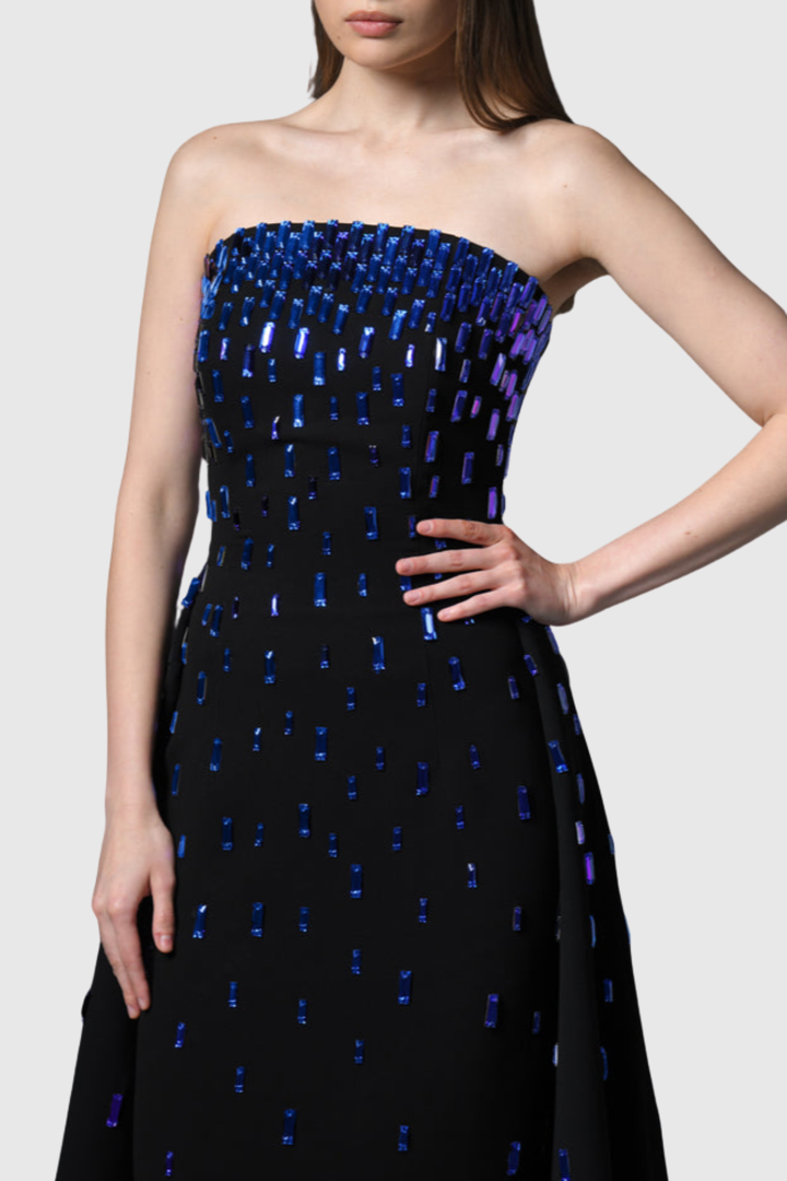 Elevate your evening wardrobe with this stunning strapless maxi dress. The rich blue hue provides a timeless foundation, while intricate crystal embellishments catch the light with every movement, creating an enchanting shimmer. The strapless silhouette offers a refined, elegant neckline perfect for formal occasions and special events. Crafted for those who appreciate understated luxury, this dress combines classic sophistication with modern glamour, ensuring you make a memorable impression.