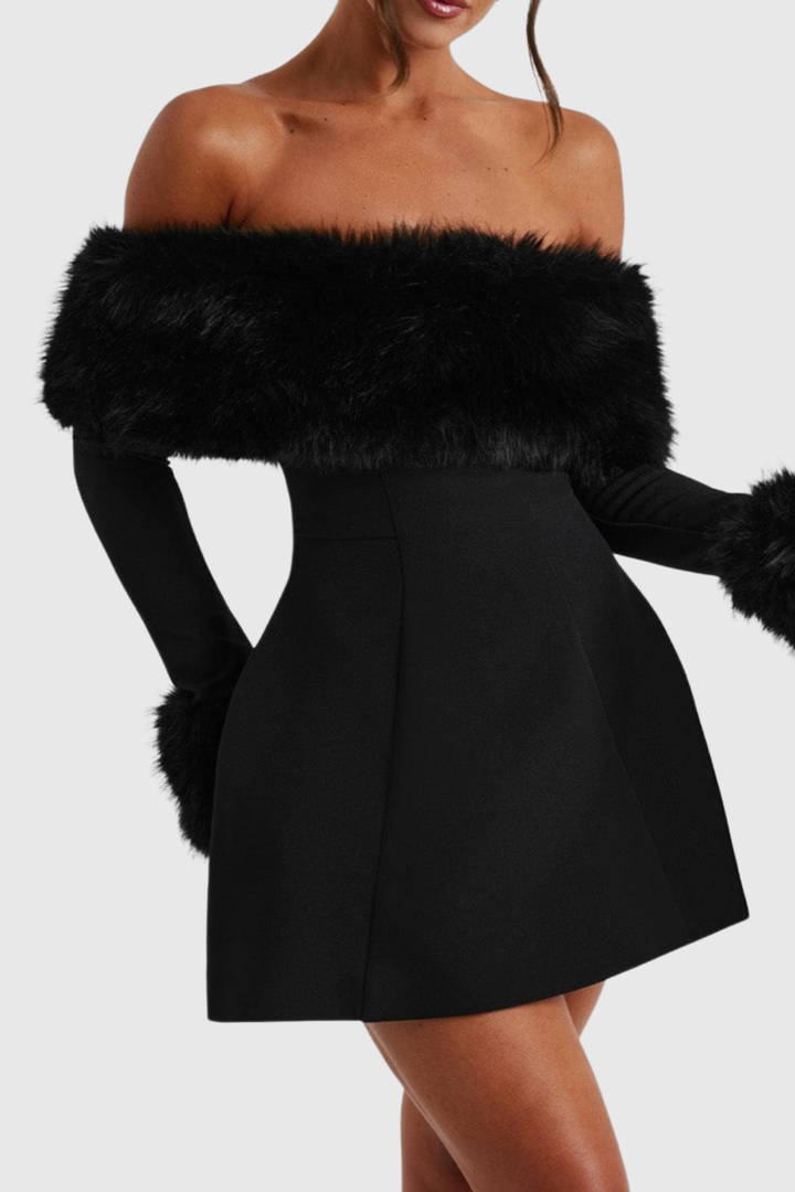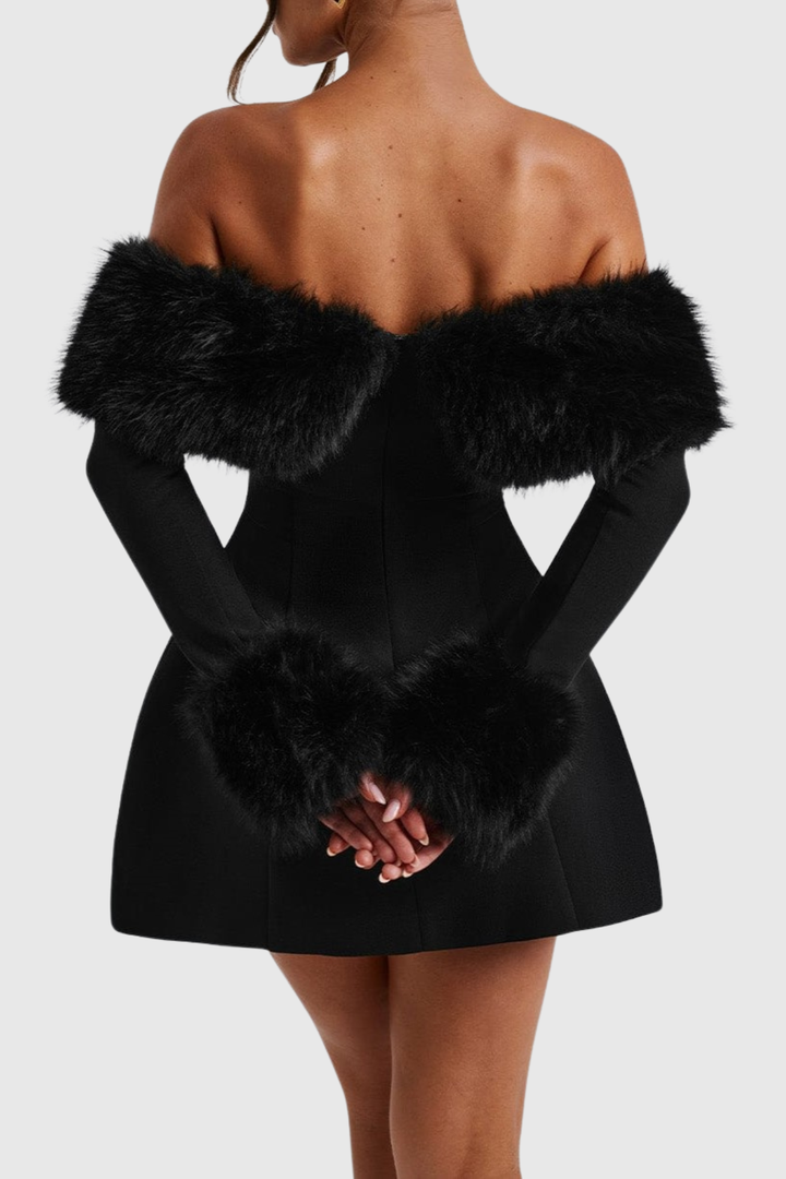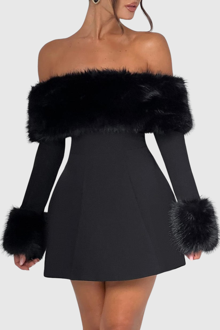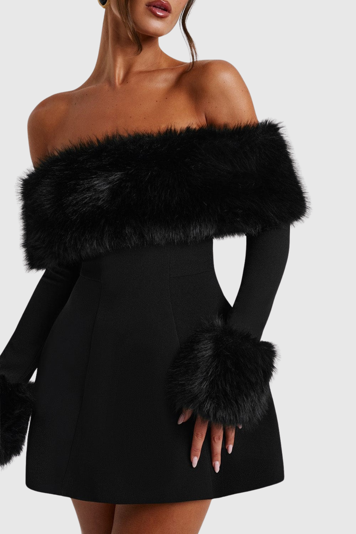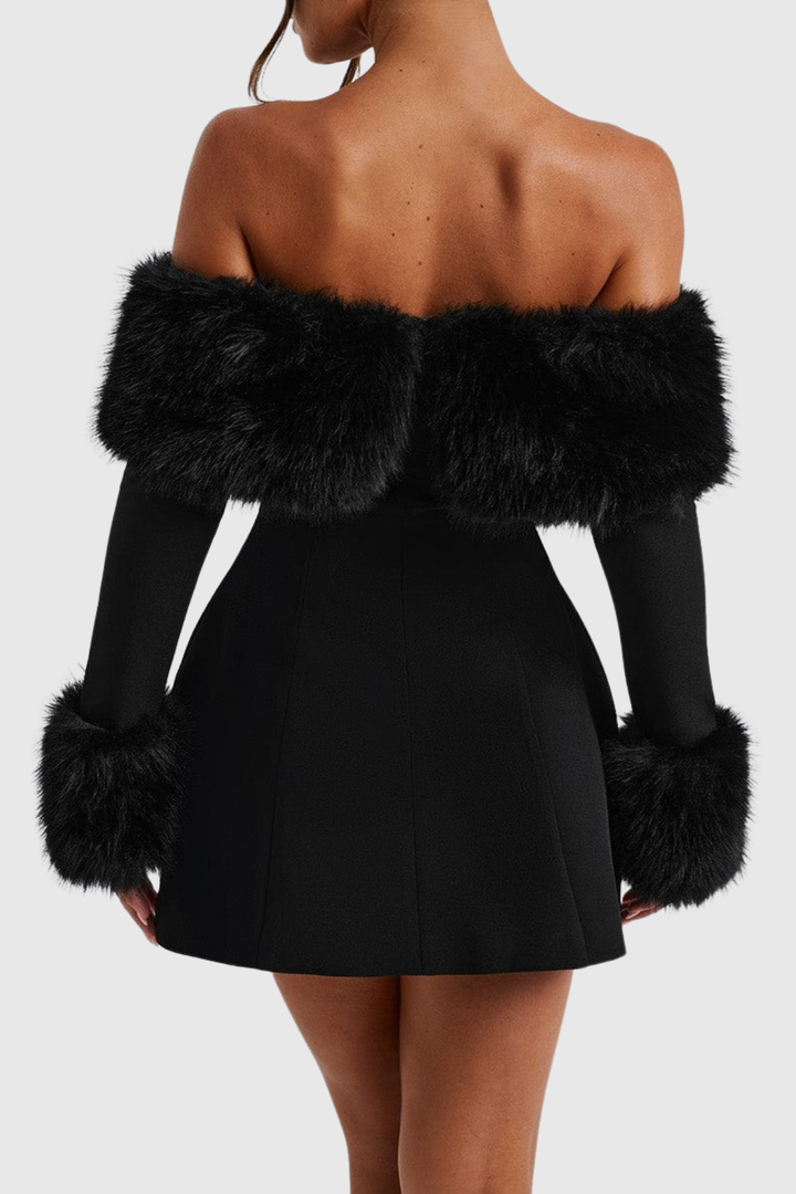 Embrace effortless elegance with this striking off-shoulder mini dress, where luxurious faux fur detailing meets contemporary silhouette. The plush texture frames the neckline beautifully, creating a statement piece perfect for evening events or upscale gatherings. Cut to a flattering mini length, this dress balances bold sophistication with wearable charm. Pair with heels and minimal accessories to let the dress command attention. An investment piece that transforms any occasion into an unforgettable moment.