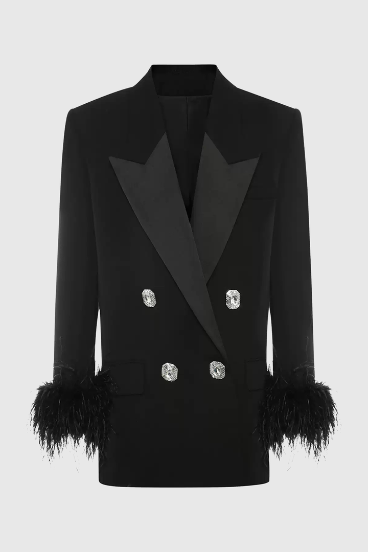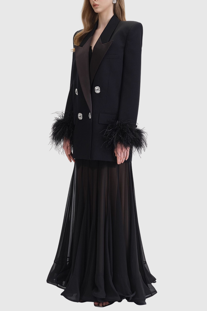 Elevate your wardrobe with the Strara Diamond Buttoned Feather Blazer. This refined piece features delicate feather detailing and shimmering diamond-inspired buttons that add subtle luxury. Designed for comfort and style, it pairs effortlessly with both formal and chic casual wear, making it a versatile addition for those who appreciate understated elegance.