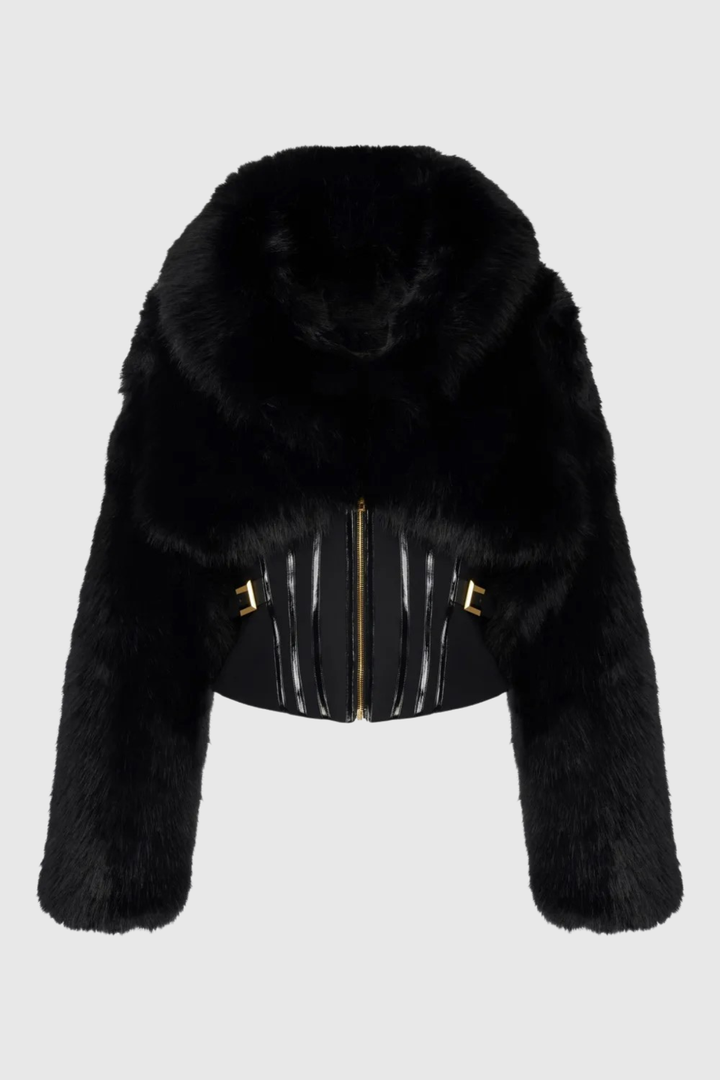Elevate your outerwear collection with this striking faux fur corset jacket, where structured tailoring meets luxurious texture. The corset-inspired bodice creates a refined silhouette while the sumptuous faux fur exterior adds an air of understated elegance. Perfect for layering over evening wear or pairing with tailored separates, this piece transitions seamlessly from sophisticated soirées to upscale casual occasions. Crafted with sustainability in mind, it delivers high-fashion impact without compromise.