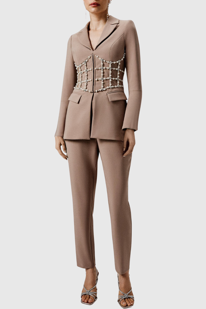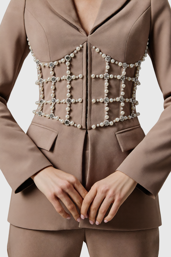 Elevate your wardrobe with the Toivo Pearl Embellished Bandage Blazer, a striking fusion of refined tailoring and contemporary glamour. Crafted from premium bandage fabric, this blazer hugs your silhouette while pearl embellishments add an understated touch of luxury. Perfect for upscale events, professional settings, or evening occasions, it transitions seamlessly from day to night. The structured fit flatters your frame while the lustrous pearl details catch the light with every movement. A versatile investment piece that commands attention and exudes confidence.