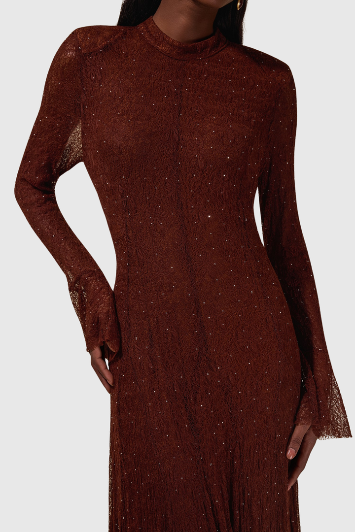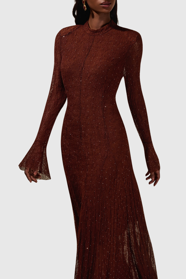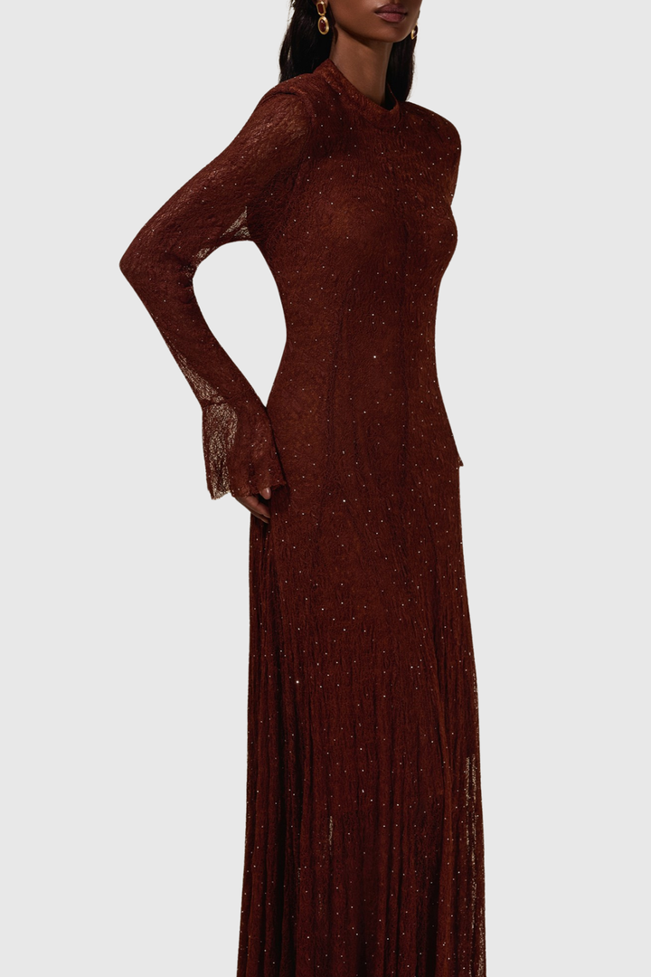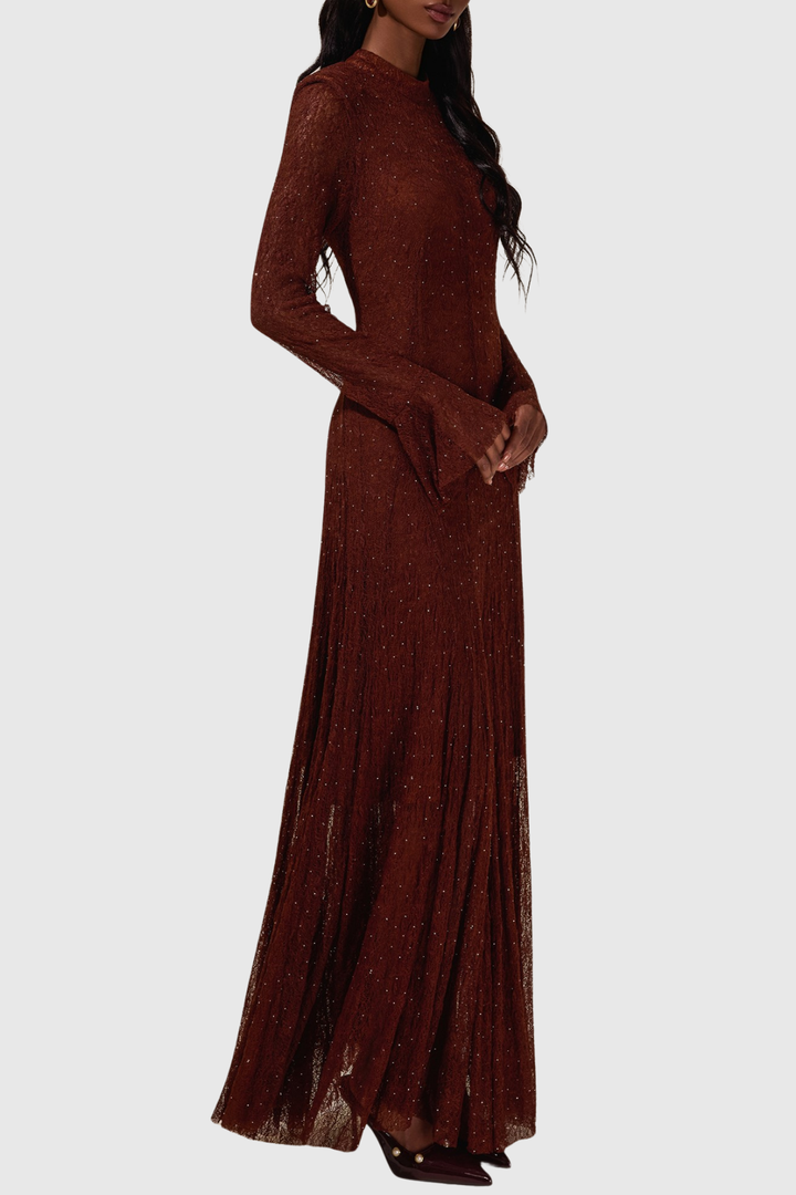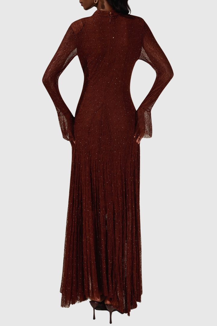 Yamila Lace Crystal Embellished Maxi Dress - Brown