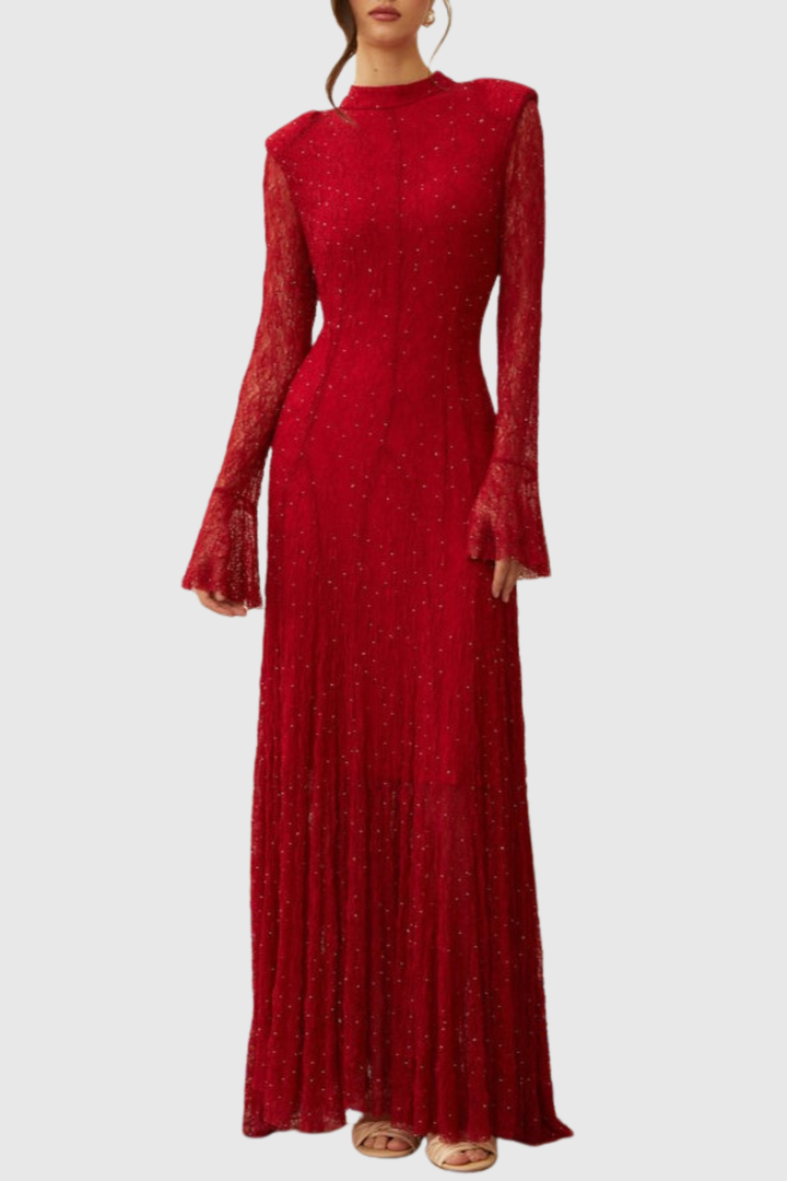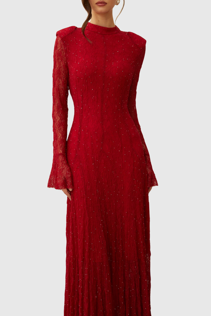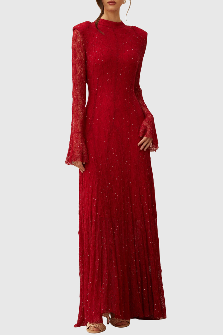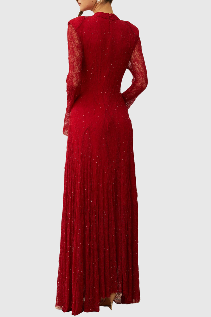 Yamila Lace Crystal Embellished Maxi Dress - Red