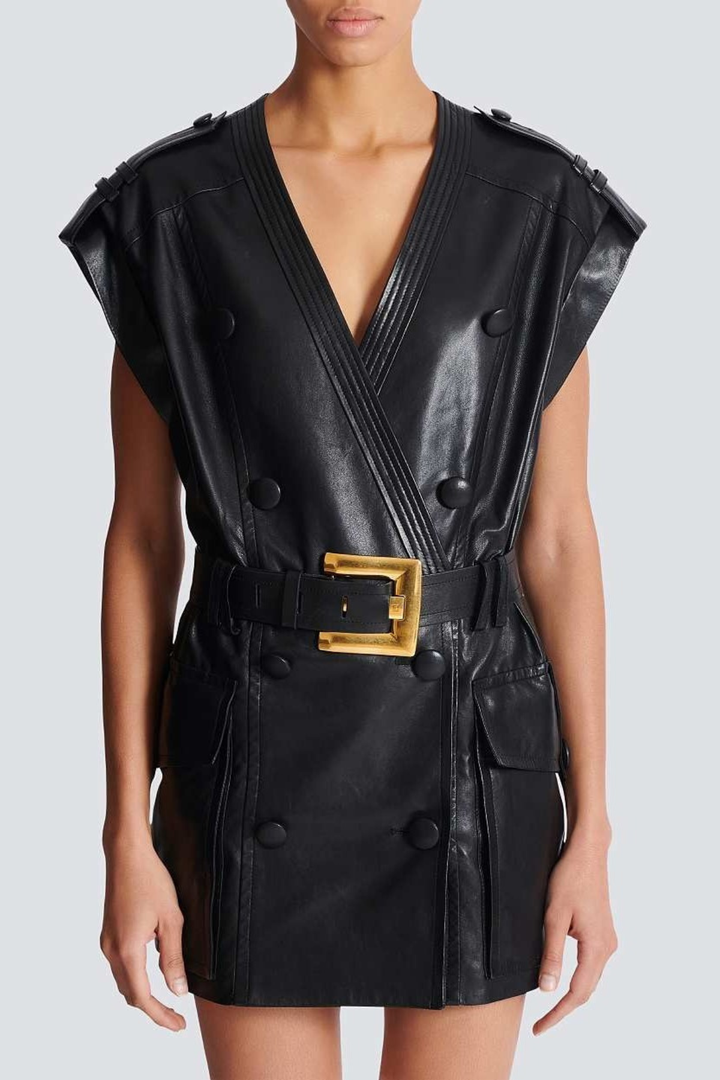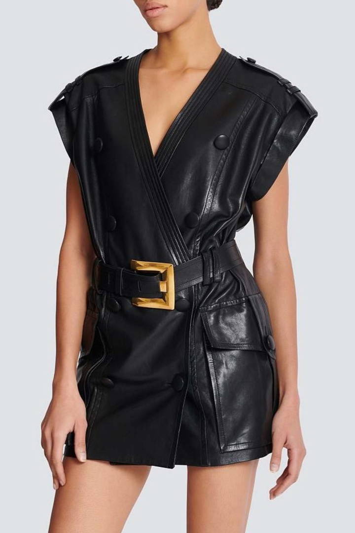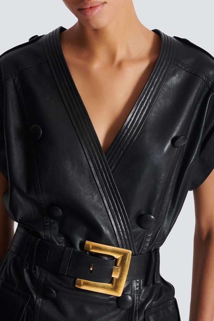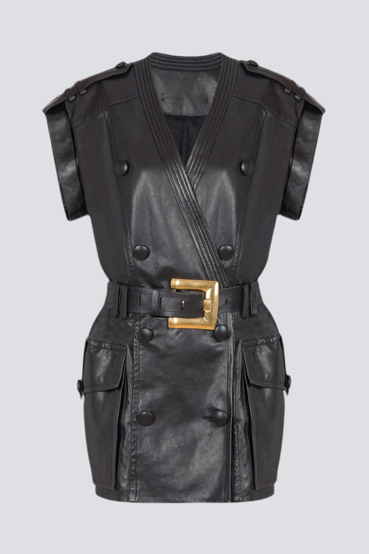 Yvaine Leather Belted Mini Dress Elevate your evening wardrobe with this sophisticated leather mini dress, designed for those who appreciate refined elegance. The structured silhouette is anchored by a statement belt that cinches the waist, creating a flattering, defined shape. Crafted from premium leather, this piece exudes luxury and confidence. Perfect for cocktail events, upscale dinners, or nights out that demand an air of understated glamour. The mini length offers a modern edge while the quality construction ensures lasting wear and timeless appeal.
