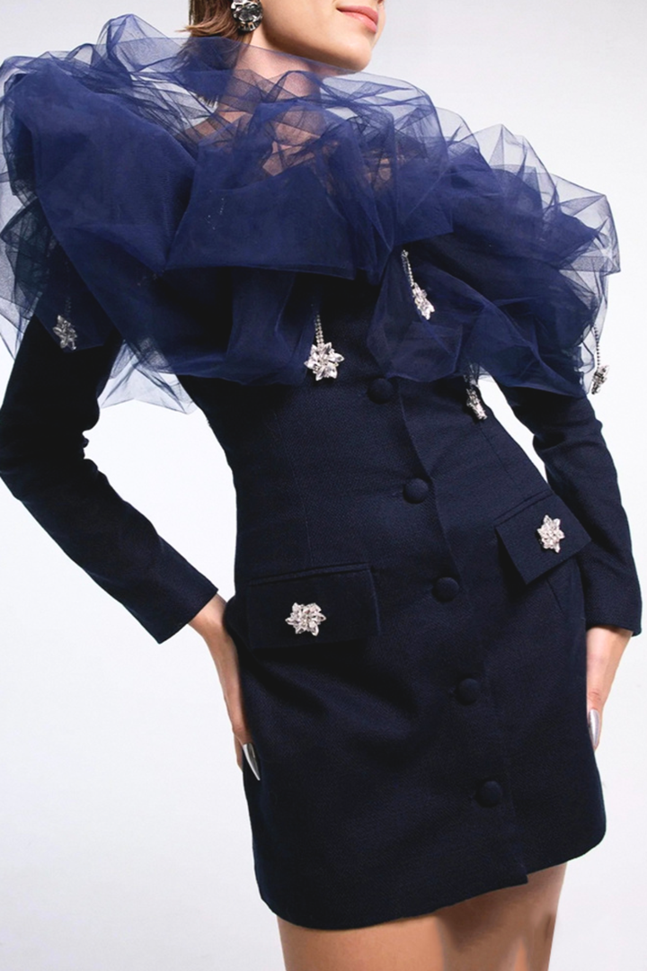 Zada Mesh Cloud Off Shoulder Mini Dress - Navy