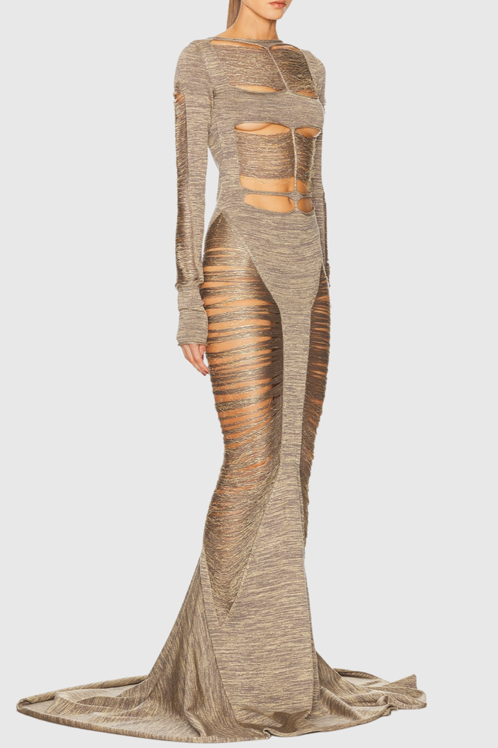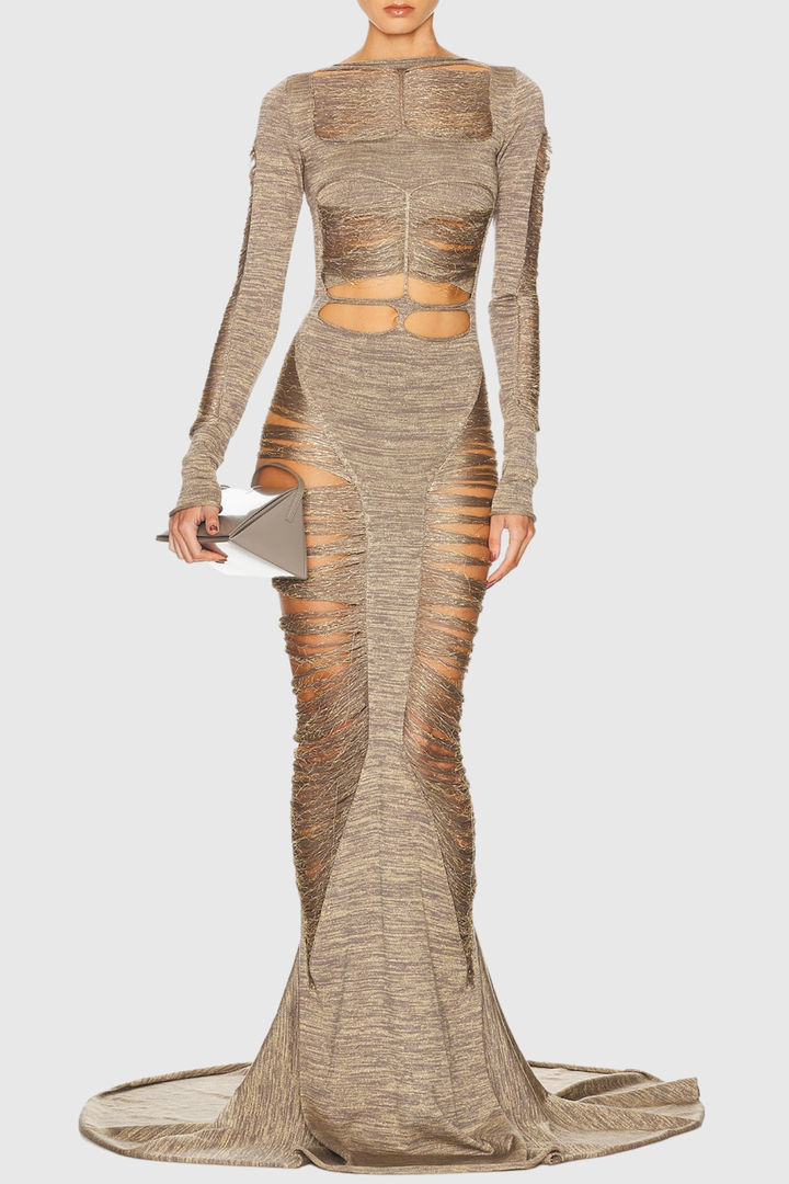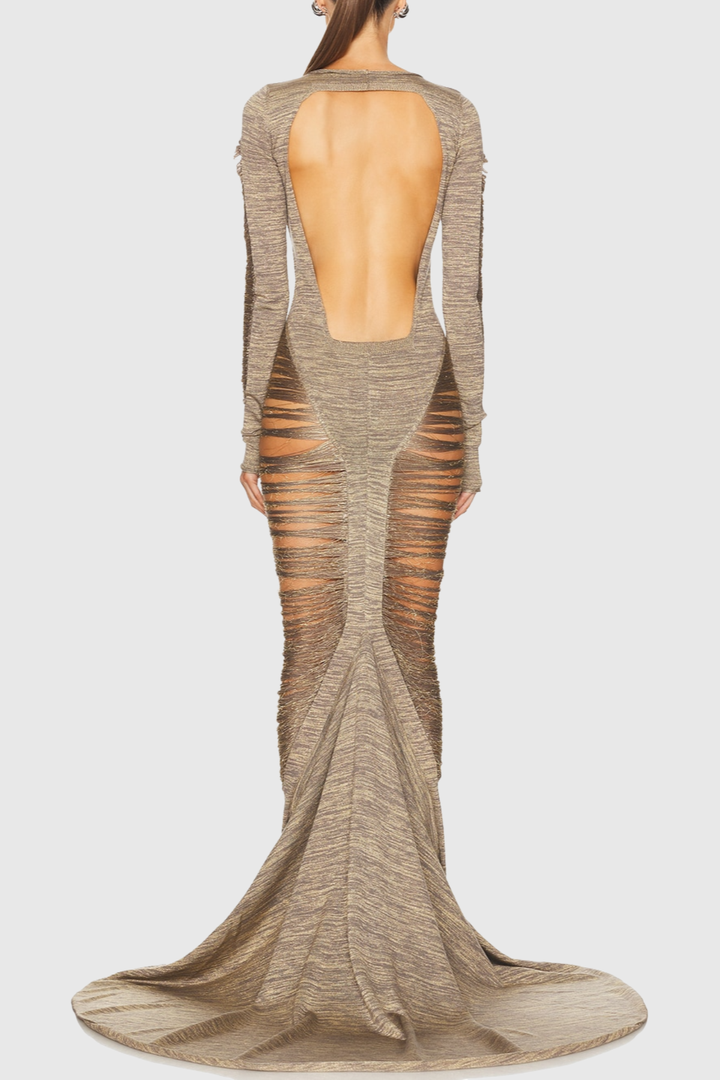 Zamza Fringe Cutout Maxi Dress Elevate your evening wardrobe with this striking maxi dress, featuring bold fringe detailing and strategic cutout accents that balance sophistication with contemporary flair. The flowing silhouette drapes elegantly, while the fringe movement adds dynamic texture and visual interest. Perfect for upscale events, cocktail parties, or nights when you want to make a refined statement. The cutout design offers a modern edge without compromising elegance, making this piece a versatile addition to any discerning wardrobe.